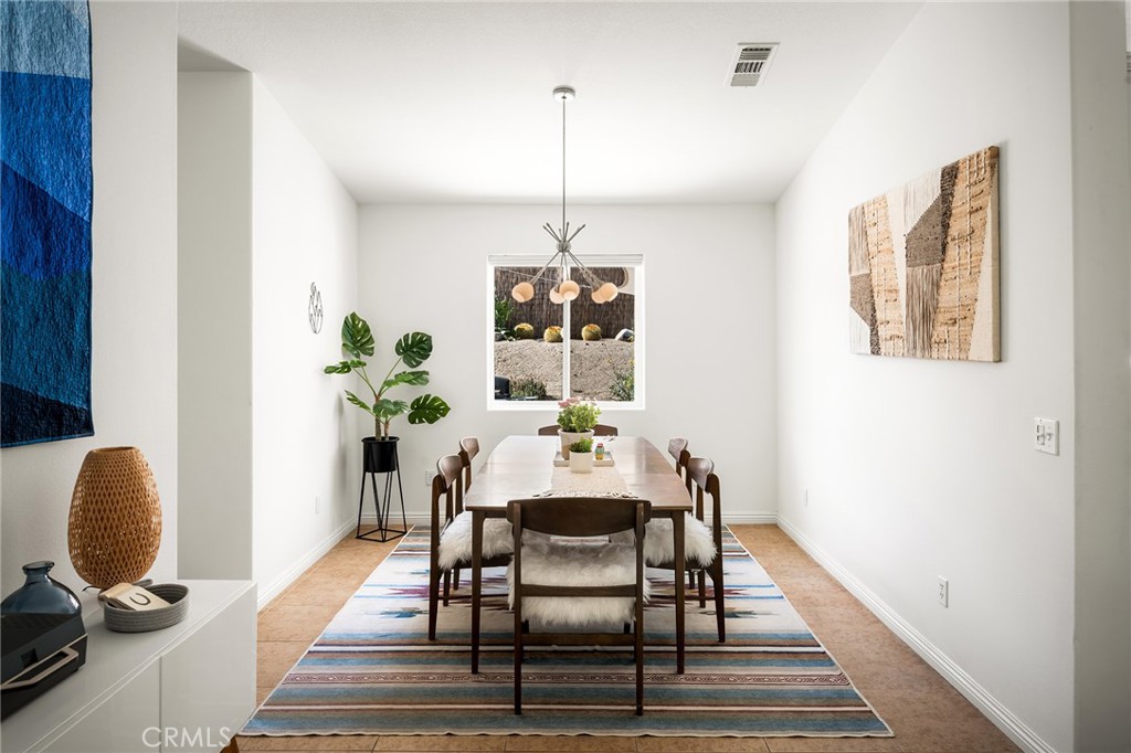 Set against sweeping mountain views in one of the area’s greenest and most established neighborhoods, this beautifully maintained 3-bedroom, 2-bath home with bonus room sits on a prime half-acre corner lot in desirable Country Club Estates. A mature, tree-lined front yard with lush desert landscaping creates exceptional curb appeal and a welcoming arrival. No HOA. Newly paved streets, connected to public sewer and natural gas, school bus stop, and a short walk to the area’s only golf course and popular café, The Roost. Conveniently and centrally located just a short drive to Joshua Tree, Pioneertown, and Palm Springs. The open-concept layout features high ceilings and abundant natural light, with mountain views visible from most rooms. Modern fixtures, ceiling fans throughout, custom blinds and curtains, and stylish flooring create a comfortable and inviting interior. The large primary suite offers a spacious bathroom with dual vanities, extra large soaking tub, walk-in shower, and a generous walk-in closet. TVs are included in all bedrooms. The fully fenced backyard is designed for entertaining and relaxation, featuring a custom patio with built-in gas fireplace and seating, raised lookout deck with outdoor queen bed, 4-person hot tub, oversized cowboy tub, shaded dining area, BBQ, and beautifully landscaped desert grounds. Additional features include a fully equipped kitchen with modern appliances, electric fireplace, laundry room with newer washer/dryer, attached two-car garage, and rare concrete roof. Offered fully furnished except for select staging items; buyers to request exclusions list. Property is move-in ready and perfectly suited as a full-time residence or an effortless desert getaway.