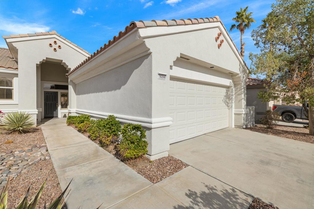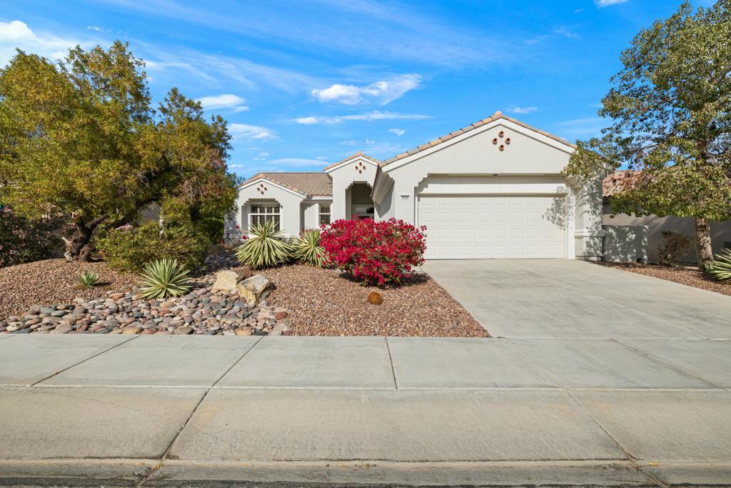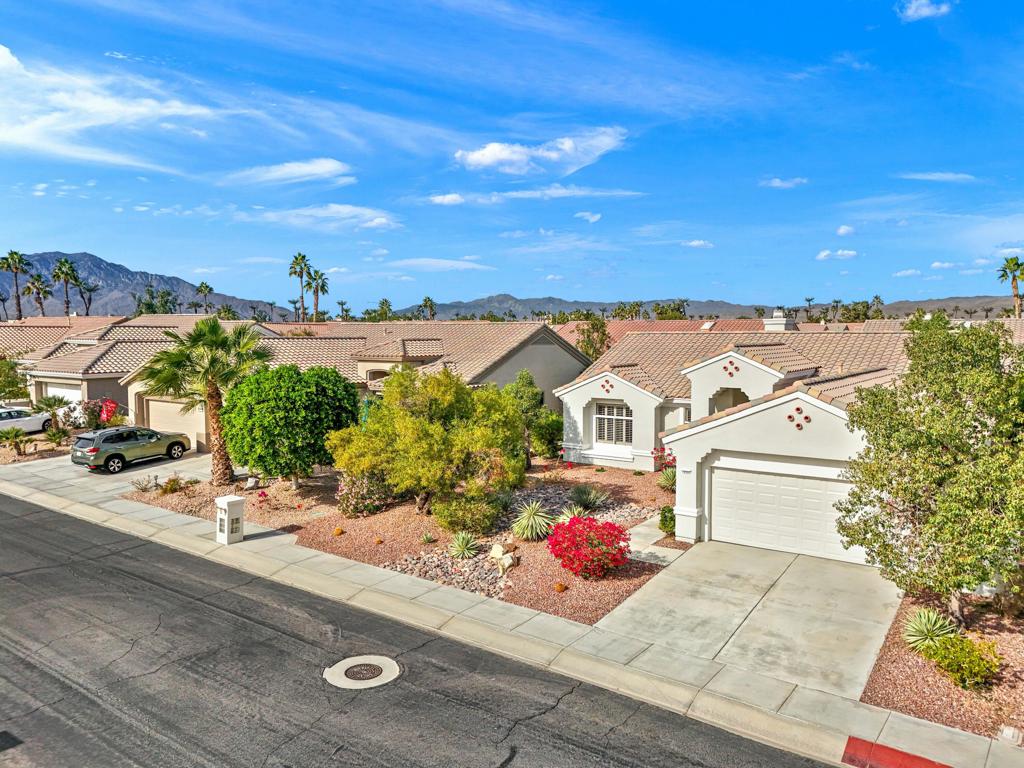 55+ Sun City Palm Desert–Morocco model with 2 bedrooms, 2 bathrooms, plus DEN/OFFICE. Great location near the main gate. NEW 5-ton HVAC Lennox (2023). Inside, high ceilings, transom windows create a light and bright home, gorgeous 24X24 inch custom tile throughout except bedrooms, and gas fireplace for chilly winter evenings. Spacious kitchen includes Corian counters, custom quartz island, upgraded cabinets and beautiful newer dark stainless appliances, and cozy breakfast nook with plantation shutters. Living room features gas fireplace with tile surround and is open to den/office and dining area all with views to the patio. Enter master suite through double doors, carpet, bay window with a view, and bath has double vanity, large shower and spacious closet. Guest bedroom has plantation shutters, carpet, and adjacent bath has quartz counter and a bathtub. Den is perfect for an office, hobby room, or extra guest space. Laundry room is between kitchen and garage and washer and dryer is included. Garage has golf cart nook. Patio is extended and has large overhang, garden wall, mature easy-maintenance landscaping, grapefruit tree too! Perfect for relaxing and entertaining. Furnishings are negotiable outside of escrow. SUN CITY PALM DESERT IS ALL ABOUT LIFESTYLE!! It has many clubs, activities, amenities, and low HOA dues. Play at 2 championship 18-hole golf courses and practice facilities, pickle ball, tennis, softball, bocci ball, 18-hole miniature golf course, an honor library, arts and crafts, a ballroom for special entertainment, and 4 saltwater pools kept at 87 degrees with hot tubs. Enjoy 2 great restaurants, a martini/coffee bar, and even a post office. It has a newly renovated classy indoor/outdoor bar with fire tables to enjoy the awesome views and our beautiful desert weather.