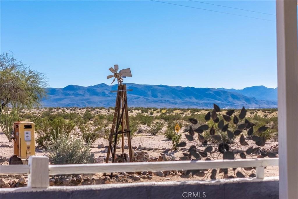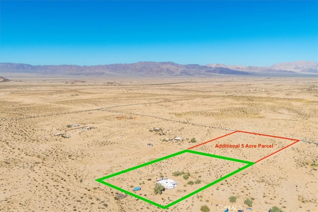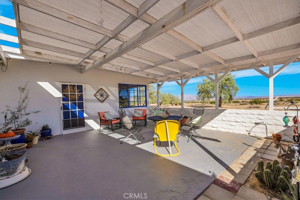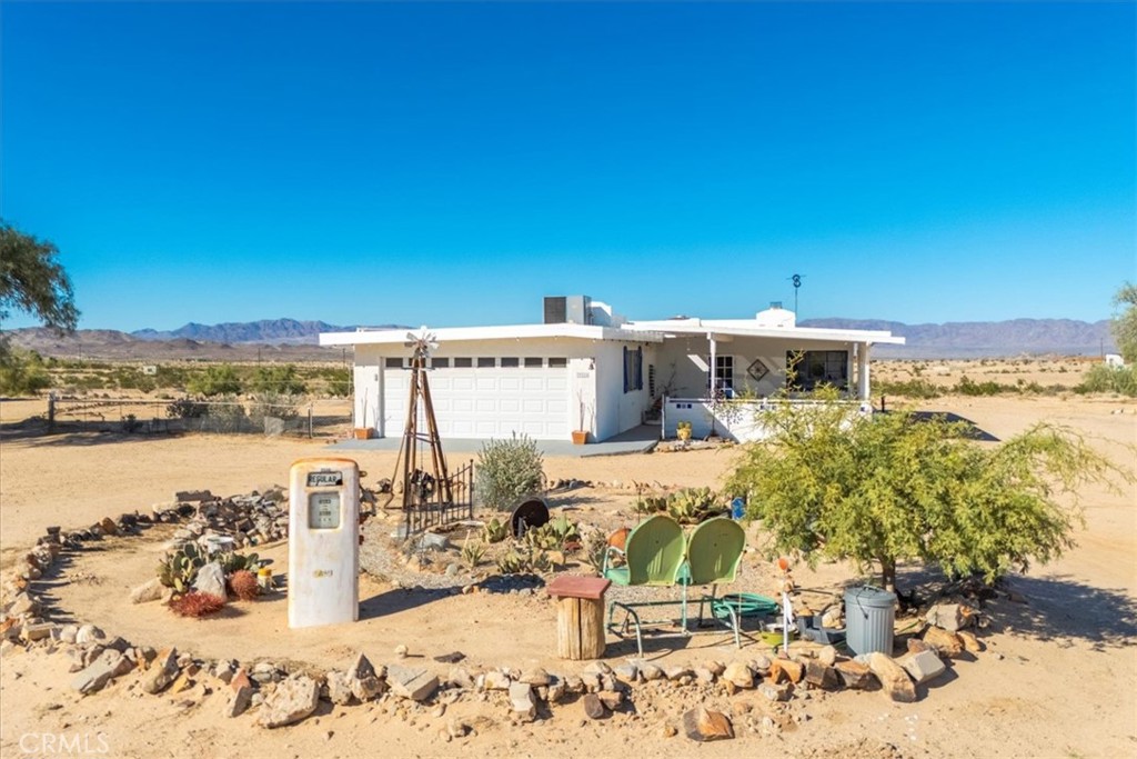 Welcome to 79116 Becker Lane, a lovely 2bed/1bath home nicely situated on a combined 10 ACRES OF LAND (two 5 acre parcels) with stunning panoramic desert and mountain views. Minimalistic living with all the comfort, this home features 1,376 square feet of living space with dual cooling (central AC/heating AND an evap cooler), an attached 2 car garage and a shared well between the two 5 acre lots. The warm and welcoming living room adorns gorgeous knotty pine ceilings, painted concrete floors, a brick-faced fireplace and several large windows that let in an abundance of natural light. The living area flows effortlessly into the quaint kitchen and dining space complete with earth-toned tile flooring, white cabinetry with a corrugated metal backsplash and a kitchen island with a sink and additional storage. The 2 bedrooms are of generous size and feature ceiling fans, concrete floors, built-in closets/shelving & they share the hall bathroom which boasts a dual sink vanity and a shower/tub combo. That’s just the inside, outside you’ll be delighted to find a large covered patio, mature desert plants and natural landscaping, an oversized carport, a fenced-in yard in the back and ample space to entertain or relax around a firepit on a starry desert night. This home is located less than 15 mins to the JTNP East Entrance as well as local shops, eateries, downtown 29 Palms & more; but still far enough away to fully enjoy all the peace and serenity our beautiful desert has to offer. A property like this rarely becomes available, come take a look & let this home’s charming allure do the rest. Your new desert home or weekend retreat awaits.