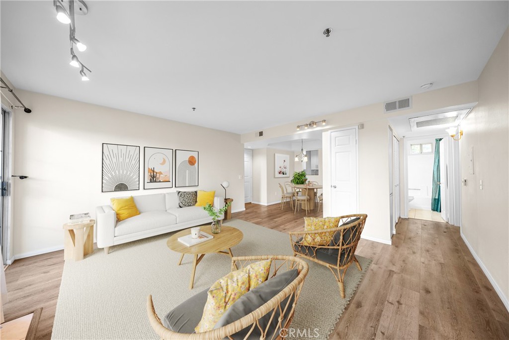 Lovely 2-bedroom, 2-bathroom condo featuring 2 dedicated tandem parking spaces, in-unit full-size laundry, and central heating and air conditioning. Designed with a thoughtful floor plan, this home offers beautiful vinyl plank flooring throughout and an open-concept living room with a gas fireplace, modern light fixtures, and double sliding doors that open to a private patio. The dining area features an architectural ceiling detail and a convenient pass-through to the kitchen. The updated and functional kitchen includes ample cabinetry, quartz countertops, an oversized stainless-steel sink and appliances, a pantry, and a cozy breakfast nook overlooking the tranquil courtyard. The primary suite features a large walk-in closet and a beautiful en-suite bathroom with a quartz vanity, shower/tub combo, and tile flooring. The nicely sized second bedroom offers pleasant courtyard views, a double-slider closet, and convenient access to additional hallway storage and a remodeled full bathroom. Additional highlights include extra storage space, a pet-friendly and controlled access building, a lushly landscaped courtyard with a fountain, a rooftop deck perfect for enjoying California sunsets and Fourth of July fireworks, a community room, and secure bike parking. Located in the heart of downtown Long Beach, you’ll be just moments from Pine Avenue, Shoreline Village, The Pike, the Aquarium of the Pacific, the Metro, and enjoy easy freeway access for commuting. Monthly HOA dues of $434 include water, trash, and sewer. Photos have been virtually staged. Building is VA approved. ****This home may qualify for special financing and a $20,000 grant – speak to your lender or Realtor to learn more.****