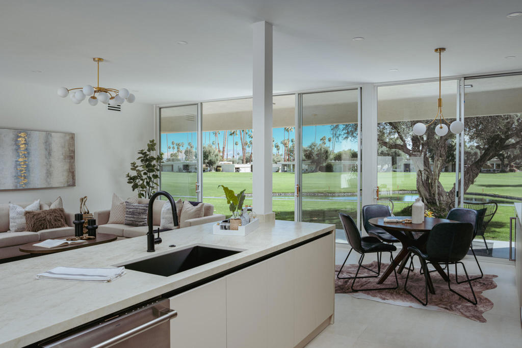 Welcome to 83 Westlake Circle, a stunning Richard A. Harrison-designed residence ideally situated on a quiet cul-de-sac within the coveted Seven Lakes Country Club. Perfectly positioned on the 18th green, the expansive terrace captures sweeping views across a double fairway, the 7th lake, and the community’s iconic waterfall fountain — a truly breathtaking setting.Completed in 2026, the exquisite renovation reimagines the home into a sophisticated 1,545-square-foot open-concept floor plan featuring two generous bedroom suites and beautifully appointed baths. Soaring ceilings and walls of glass create an effortless indoor-outdoor flow, to a spacious and private courtyard framed by panoramic views of Southridge and the San Jacinto Mountains.Designed for both comfort and convenience, the residence includes a newer HVAC system, an assigned garage parking, and immediate access to a serene pool and spa just steps away.Beyond the 24-hour guarded gates, Seven Lakes — known as ”The Gem of the Desert” — offers an elevated lifestyle centered around its Ted Robinson-designed 18-hole executive golf course. Residents enjoy 15 pools and spas with pool houses, tennis courts, and the iconic William Cody-designed clubhouse featuring formal dining, a casual cocktail lounge, and a scenic terrace overlooking the waterfall fountain.This is quintessential Palm Springs living — architecturally significant, impeccably renovated, and surrounded by extraordinary views.