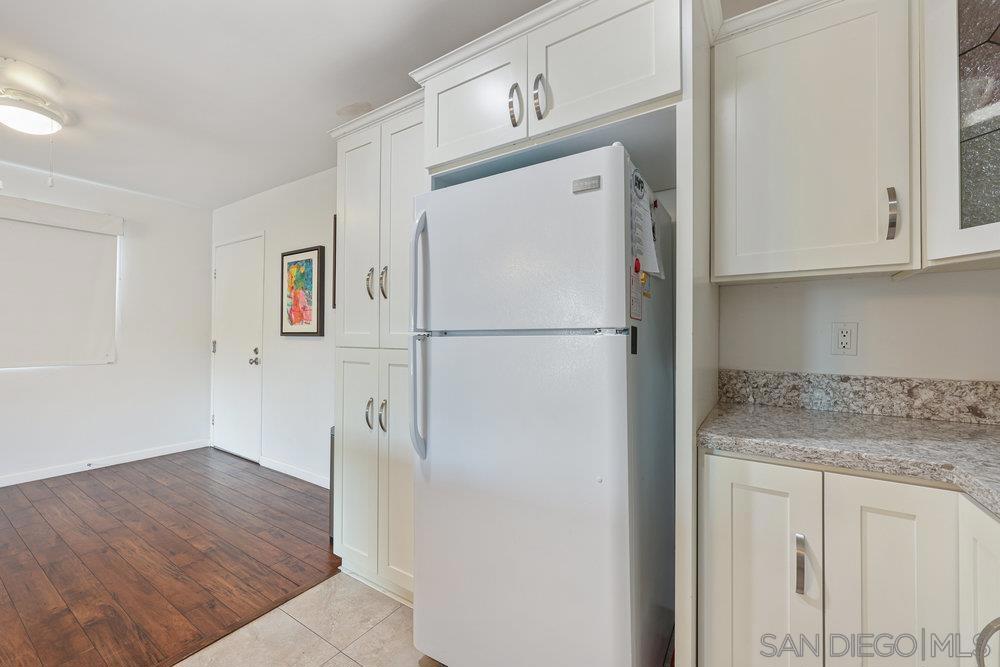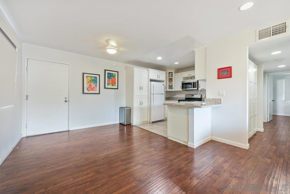 Welcome to this beautifully upgraded downstairs condo, offering 2 bedrooms and 2 bathrooms in a bright, open layout designed for both comfort and style. The kitchen shines with granite countertops, custom cabinetry, and ample workspace for everyday cooking or entertaining. The inviting living room is anchored by a cozy fireplace and flows seamlessly onto a private patio—perfect for morning coffee or evening relaxation. Inside, you’ll find rich laminate flooring, upgraded windows that fill the space with natural light, and a convenient in-unit laundry closet with a stacked washer and dryer. Both bathrooms have been fully remodeled with fresh, modern finishes that create a spa-like feel. The oversized primary suite is a true retreat, featuring a custom built-in wardrobe system with thoughtfully designed cabinets and drawers for maximum storage and organization. This home also includes a private attached garage with direct entry into the residence, plus TWO additional community parking spaces—an excellent combination of convenience and security. The community offers resort-style amenities, including a sparkling pool and a relaxing spa. The location is ideal: just off the 805 freeway, providing easy access to the highway, shopping, dining, and everyday conveniences. Move-in ready and thoughtfully updated, this condo perfectly blends comfort, convenience, and modern style—don’t miss the chance to make it yours!
