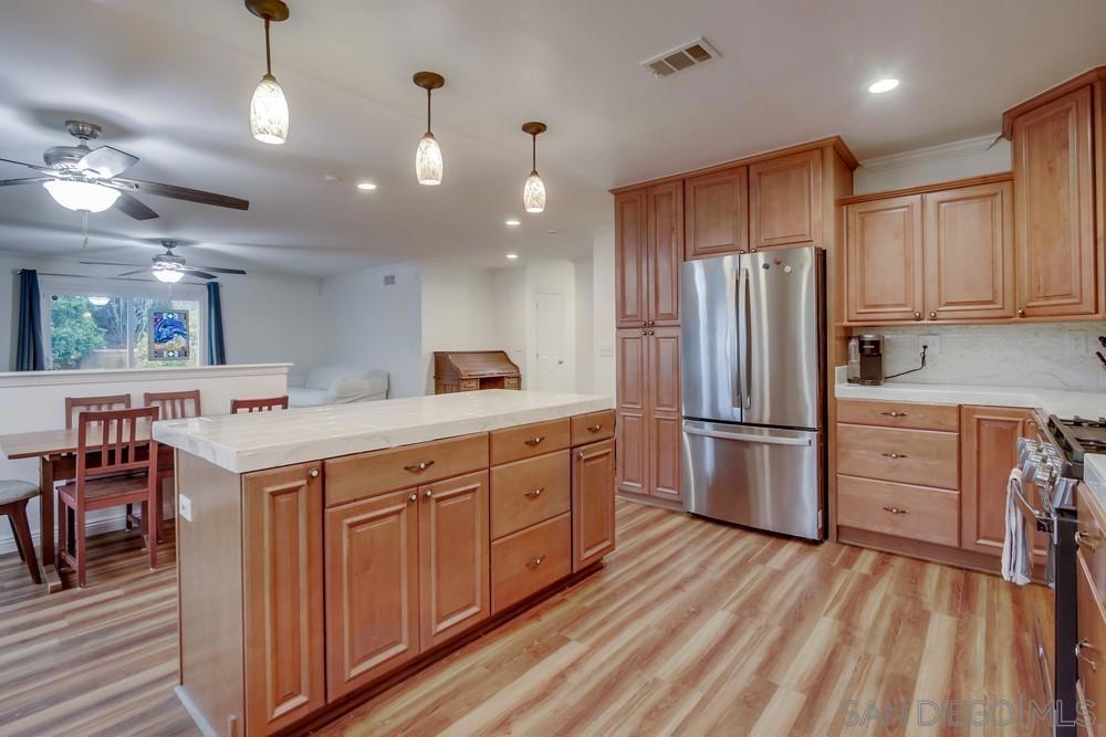 This thoughtfully upgraded, single-level home offers 1,404 square feet of well-designed living space, featuring three spacious bedrooms and two modern bathrooms. Move-in ready with fresh paint and quality finishes throughout, the home perfectly blends comfort and style. The open-concept layout flows seamlessly between the dining, kitchen, and living areas, all enhanced by durable luxury vinyl plank flooring, making it ideal for daily life and hosting. The bright family room is anchored by a cozy fireplace, while the standout kitchen is a chef’s dream, boasting a large center island, upgraded cabinetry, a new sink, and modern stainless steel appliances. Year-round comfort is ensured thanks to recent upgrades, including newer dual-pane windows, updated interior doors, and a recently installed central air conditioning system. Outside, the property shines with beautiful front-yard curb appeal. The expansive backyard serves as a private escape, featuring a shaded gazebo, an efficient irrigation system, and a bounty of mature fruit trees, including orange, tangerine, mandarin, and loquat. Parking is a breeze with a spacious two-car garage and a generous driveway. Situated in a highly desirable Santee neighborhood, you are just moments away from excellent schools, local shopping, dining, Santee Lakes, and popular hiking trails. Best of all, you can enjoy these benefits with no HOA or Mello-Roos fees. This home combines charm, convenience, and comfort, don’t miss your chance to make it yours!