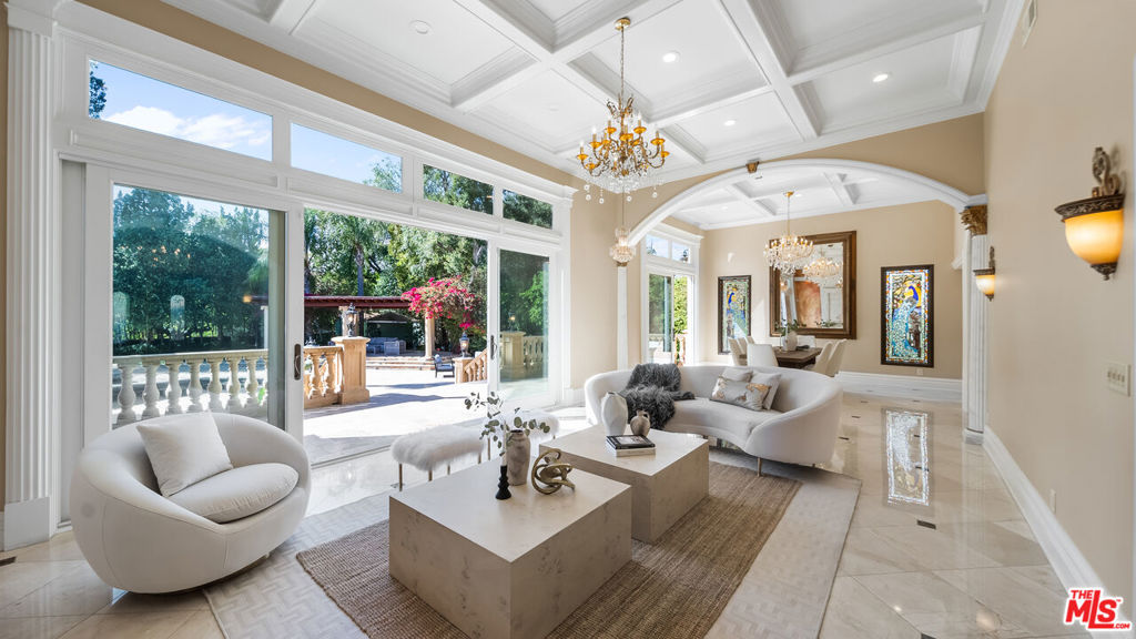 Exquisite Mediterranean Estate in Chatsworth! Welcome to this elegant, reimagined beauty in the heart of Chatsworth! Nestled on an expansive 18,000+ SQFT lot, this luxurious 5-bedroom, 4-bathroom residence offers nearly 4,300 SQFT of living space, showcasing high-end finishes and impeccable craftsmanship.From the moment you enter, you’ll be captivated by soaring ceilings, stunning custom arches, and gleaming marble floors bathed in natural light. The state-of-the-art chef’s kitchen is a true masterpiece, featuring a 6-burner gas Wolf range, built-in custom Sub-Zero refrigerator, oversized eat-in island, skylight, dramatic marble backsplash, and stainless steel farmhouse sink. Designed for grand entertaining, the formal living and dining areas boast coffered ceilings, Roman/Greek columns, dazzling chandeliers, and an elegant White Carrara marble fireplace. A second living room on the lower level offers a full wet bar, Italian-inspired fireplace, and custom sliding doors leading to the breathtaking backyard.Step outside to your private oasis, where travertine floors, an expansive patio, and a full outdoor kitchen create the ultimate indoor-outdoor living experience. Take a dip in the sparkling pool, surrounded by lush greenery and resort-style landscaping. The luxurious primary suite features a private balcony, generous walk-in closet, sunken jetted tub, glass-enclosed shower, and dual vanities with a makeup counter. With two additional bedrooms upstairs and two on the lower level, this home offers ample privacy and space for family and guests. Owned Solar! A custom 3-car garage with a workbench and storage completes this extraordinary home. This estate truly has it all elegance, space, and resort-style living! Don’t miss this rare opportunity! Schedule your private showing today! CLICK ON THE VIRTUAL TOUR LINK FOR A FULL VIDEO.