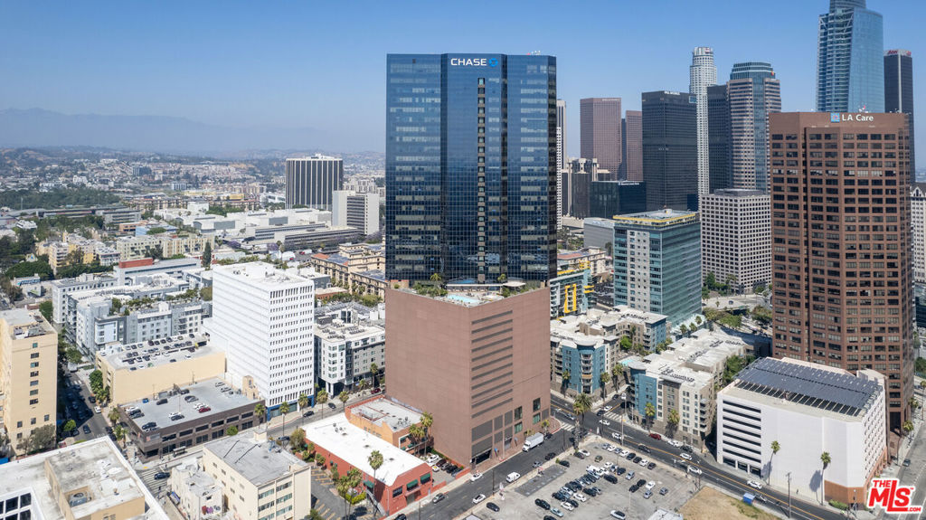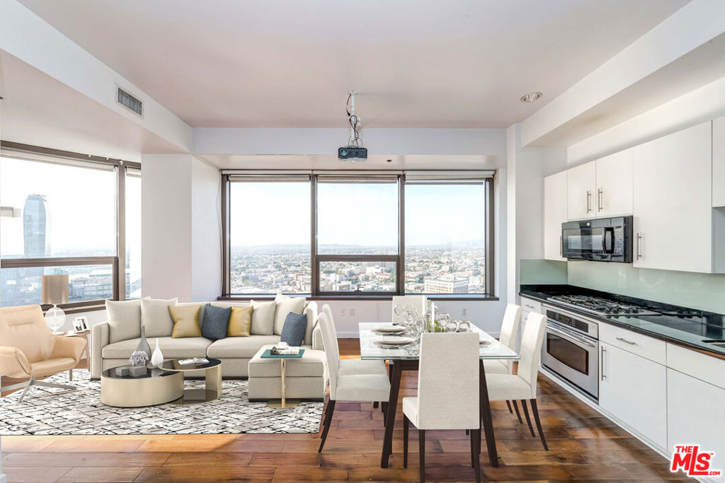 A rare corner loft suite on the 22nd floor offering sweeping southwest facing panoramic views of the Downtown LA skyline, LA Live, the Westside, and the resort style sky deck with pool. The flexible den functions perfectly as a breakfast nook or home office. The modern European style kitchen features upgraded appliances, granite countertops, and elegant cabinetry, complemented by wood floors throughout. A glass partition subtly separates the living and sleeping areas while maintaining an open airy loft feel. Additional highlights include an in unit LG washer and dryer, a spacious bathroom with storage, and two side by side parking spaces. Residents enjoy resort quality amenities, including a 17th floor sky deck with a heated infinity pool, spa, cabanas, lounge beds, wet bar, BBQ grills, and a fire pit lounge area. The building also offers a fully equipped fitness center, media and screening room, business center, and 24 hour concierge, security, and on site management. Located just moments from LA Live, Crypto.com Arena, the Convention Center, public transit, restaurants, and major freeways, this corner unit combines exceptional design, bright and open living, and the very best of downtown lifestyle.