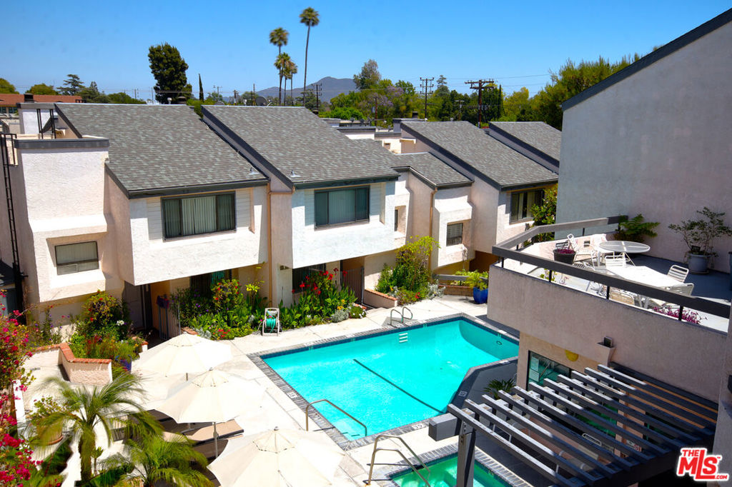 Welcome to this beautifully maintained and light-filled 3-bedroom, 2.5-bathroom end-unit townhome located in the highly desirable and gated Magnolia Tree Villas community in Valley Village. Offering over 1,645 sq. ft. of well-designed living space, this rare corner unit lives like a private home with only one shared wall, lush garden surroundings, and an abundance of natural light throughout. The main level features a spacious kitchen with ample cabinetry and generous counter space, flowing seamlessly into the formal dining area. Just beyond, the step-down living room boasts a cozy fireplace and opens directly to a private patio perfect for morning coffee, alfresco dining, or relaxing with friends. Upstairs, the expansive primary suite includes vaulted ceilings, a large walk-in closet, and a private en-suite bathroom. Two additional bedrooms, each bright and airy, share a full hallway bath. A full-size laundry area with side-by-side washer and dryer is conveniently located near all three bedrooms. Since the unit faces Magnolia Boulevard, one of its key advantages is that your windows do not face another building offering added privacy and open views. Even better, the home is equipped with sound-reducing windows that help maintain a peaceful, quieter indoor environment despite the central location. This townhome also includes two side-by-side subterranean parking spaces, along with 10 additional non-gated guest spots, plenty of room for visitors. The well-managed HOA includes earthquake insurance, water, sewer, garbage, and common area maintenance, offering peace of mind and excellent value. Magnolia Tree Villas offers resort-style amenities including beautifully landscaped grounds, secure entryways, an elevator, a sparkling pool and spa, a fully equipped fitness center, and a relaxing outdoor seating and party area. The community is ideally located within the highly sought-after Colfax Charter School district, near Metro lines, major studios, Ventura Boulevard, local parks, and the vibrant NoHo Arts District with easy access to freeways and daily conveniences. This is a rare opportunity to own a stylish, townhome in one of Valley Village’s most sought-after communities. Don’t miss your chance to enjoy the perfect blend of comfort, location, and lifestyle.