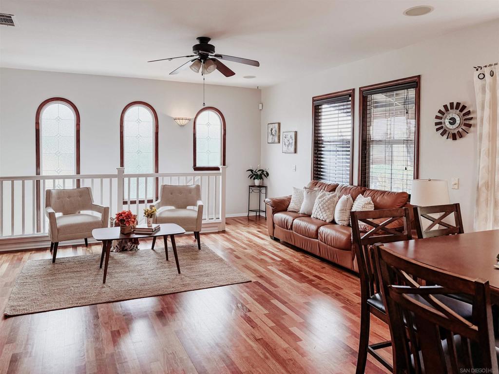 This beautifully maintained townhome features an open floor plan with high-end touches throughout, including upgraded kitchen counters, refinished hardwood floors, ceiling fans, designer paint, a private balcony, and a cozy fireplace in the living/dining area. All living spaces are located on the second floor with direct access from the attached 1-car garage.The master suite includes a spacious walk-in closet . The home comes with a dedicated laundry room for convenience. With fully paid solar to offset electricity costs and zoning for the top-rated Poway Unified School District, this home offers both comfort and value. Ideally situated in one of the best locations within the Monaco complex, residents enjoy community amenities such as a sparkling pool and spa, along with close proximity to shopping, dining, parks, schools, and easy freeway access. Torrey Meadows Park and the highly ranked West View High School are just few blocks away.