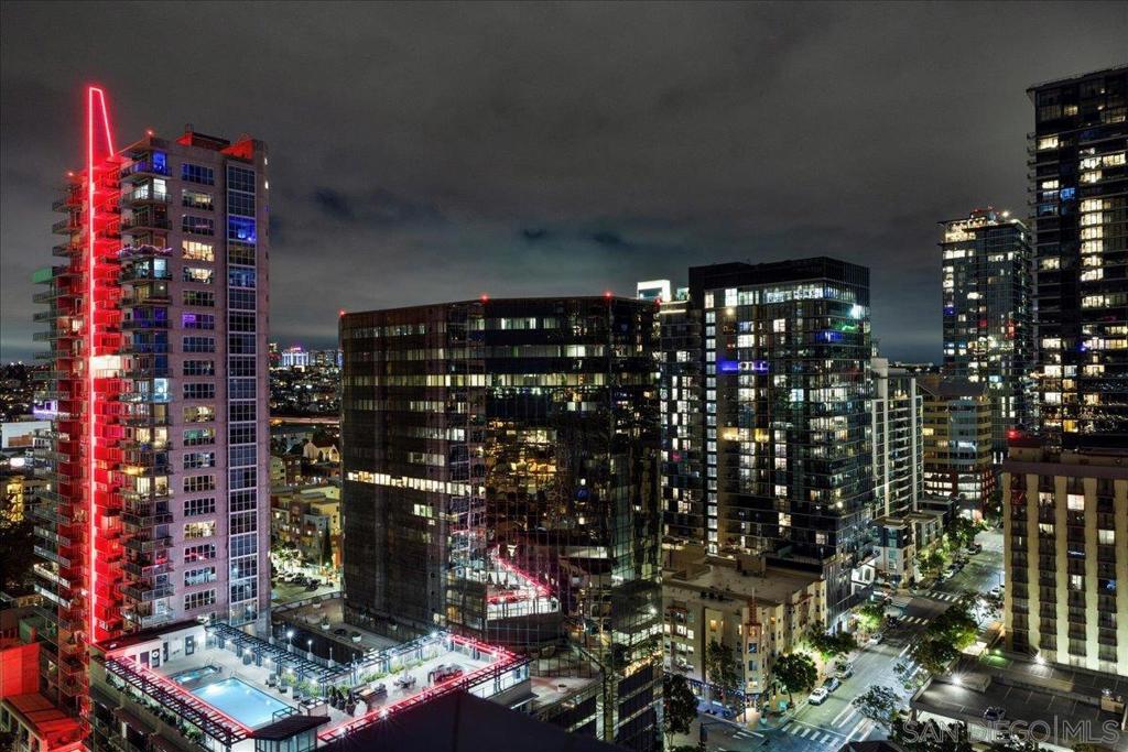 CITY VIEWS! Welcome to Savina! Downtown San Diego’s newest and most luxurious condo high-rise. Perched on the 20th floor, this stunning east-facing residence offers an ideal split-bedroom layout (no shared wall), perfect for privacy and functionality. Located at the vibrant intersection of Little Italy and the Columbia District, Savina is one of Bosa’s premier developments renowned for exceptional design and quality craftsmanship. Step inside to find an open-concept floor plan filled with natural light, hardwood flooring, and expansive windows that frame the panoramic city skyline views. The gourmet kitchen is a chef’s dream with a large waterfall-edge quartz island, hidden paneled Thermador refrigerator, and soft-close cabinetry. The dining area is currently used as a home office, making the most of the versatile layout. Both bedrooms feature blackout shades and the private balcony is perfect for enjoying San Diego’s cityscape and watching planes fly in. Additional highlights include a large private storage unit and one of the most amenity-rich offerings in Downtown: 24-hour concierge and security, resort-style pool and spa, state-of-the-art fitness center, steam and sauna rooms, resident lounge with a full kitchen and BBQ area, EV charging, dog run and pet spa, bicycle tune-up station, and more. Experience high-rise living at its finest!