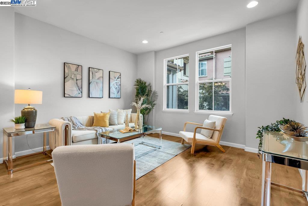 Welcome to this stunning modern contemporary North facing townhouse style condo in Fremont’s highly sought-after Montebello Community of Warm Springs. Built by KB Homes, this beautifully designed residence features 9 ft tall ceilings, abundant natural light, and an open layout with separate living, dining, and family rooms. The chef’s kitchen offers oak-style cabinetry, granite countertops with tile backsplash, stainless steel appliances, and a center island with bar seating. The spacious primary suite boasts sloped high ceilings, a private balcony for relaxation, a spa-inspired bathroom with dual vanities, a split layout for privacy, and a walk-in closet. A versatile downstairs room can serve as a bedroom, office, or playroom. Additional highlights include laminate flooring in the main living areas, new upgraded carpet upstairs, recessed lighting, Bose surround sound speakers, multi-zone heating and A/C, in-unit laundry, and a two-car attached garage. Community amenities include a playground and clubhouse—perfect for gatherings and play. Conveniently located near top-rated schools, shopping, dining, and major commute routes, this home offers the perfect blend of comfort, style, and convenience. A must-see!