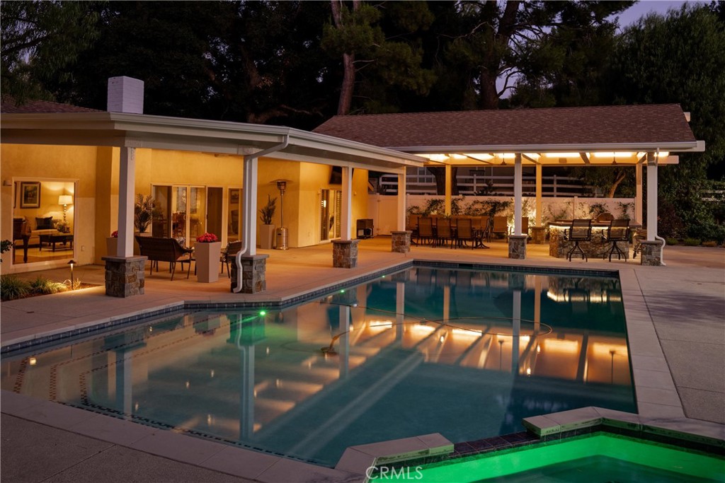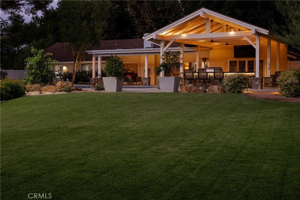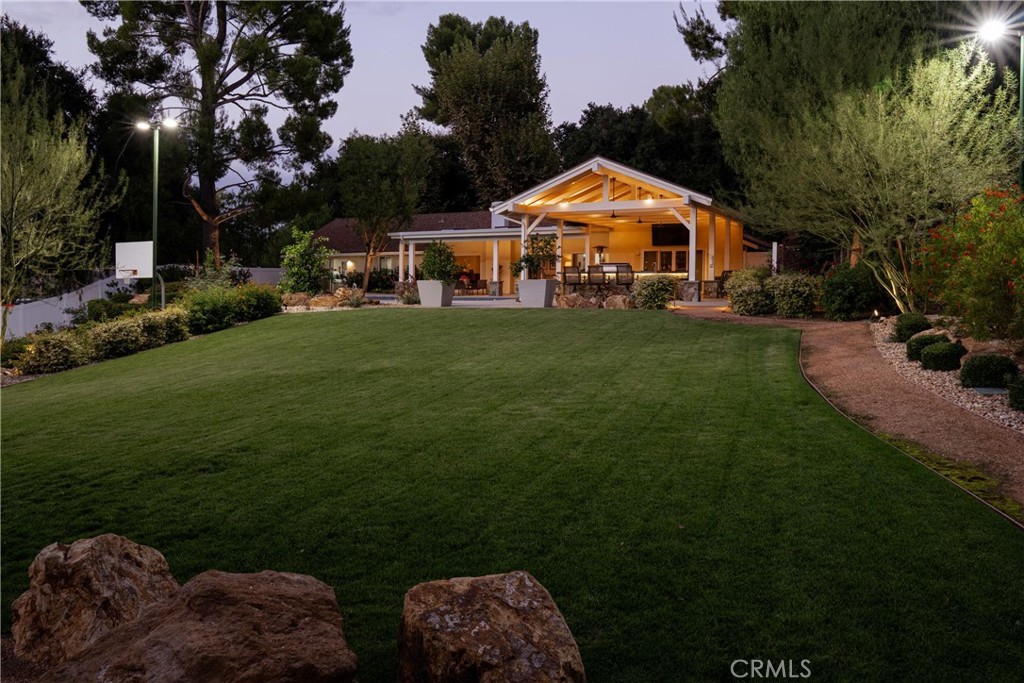 Single-Story Entertainer’s Dream home in Sand Canyon. The backyard is a true resort-style oasis with a sparkling pool and spa, oversized covered patio with skylights and commercial-grade lighting, 83” outdoor TV with sound system, masonry BBQ island, huge lawn, sports court, fruit trees, and mature trees for privacy. Perfect for entertaining or relaxing, this yard was designed to enjoy year-round. Designed with seamless California indoor-outdoor living in mind, this home offers an open floor plan with family and living rooms and the chef’s kitchen boasts granite counters, a farmhouse sink, tile backsplash, updated appliances, and pantry with pull-out shelving. The den features a custom-built entertainment center for added functionality. The expanded primary suite is a true retreat, featuring its own private patio with mountain views, a spacious sitting area, custom walk-in closet, and a spa-like bathroom with heated tile floors, dual vanities, a makeup station, jacuzzi tub, walk-in shower, and bidet-style toilet. Three additional bedrooms include custom closets and fresh finishes, while the remodeled guest bath offers new cabinetry, sinks, and a beautifully tiled shower enclosure. Major upgrades include a new Class A roof, 16 SEER HVAC, water heater, energy-efficient windows/doors, solid-core interior doors, crown/base moldings, updated flooring, new epoxy garage, and upgraded 200-amp electrical panel. A rare opportunity to own one of Sand Canyon’s premier homes!