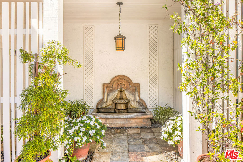 Serene Sanctuary Behind Private Gates in Desirable Beverly Glen. Enter through a secluded gate into a lush courtyard oasis, where mature foliage, vibrant potted blooms, and the tranquil melody of a water fountain set a gracious tone for this refined residence. Ascend from the welcoming foyer, complete with a bespoke cedar-lined coat closet to a sunlit living space graced by soaring ceilings, warm hardwood floors, and elegant double-paned windows framed in rich wood shutters. The open plan invites grand entertaining as easily as tranquil intimate evenings by the piano, with a seamless flow into a charming dining area. Revel in a gourmet kitchen anchored by hand-finished wooden counters and gleaming stainless appliances, custom white cabinetry, and an alcove ceiling that bathes the space in light. Enjoy mornings at the inviting breakfast bar or lose yourself in a cozy nook, perfect for savoring coffee, reading recipes, or quiet contemplation. Storage abounds, and a discreetly housed laundry space offers convenience. The main-level primary suite is awash in serenityairy, bright and beautifully appointed with generous closets, custom built-ins, and a spa-inspired bath featuring a deep soaking tub, glass-enclosed shower, and signature Toto fixtures. A sculptural mezzanine bridge floats above the living room, leading to a grand vaulted-ceiling great room complete with media features and French doors revealing a private yard. Jardin-style landscaping, a canopy of shade, and alfresco seating create a sublime outdoor retreat. Two additional bedrooms, one with a balcony, another with dramatic timber ceilings, open directly to the enchanting yard and share a richly-appointed bath with artisan wood finishes. Discover thoughtful touches throughout: a spacious two-car garage with extra storage, central vacuum, and moments-away access to Beverly Glen Center’s acclaimed restaurants, coffee, and entertainment. A rare opportunity to live enveloped in tranquility, sophistication, and inspired design all minutes from both Westside culture and Valley convenience. Note: Dining room, kitchen chandeliers, and silk drapes on the lower level excluded.