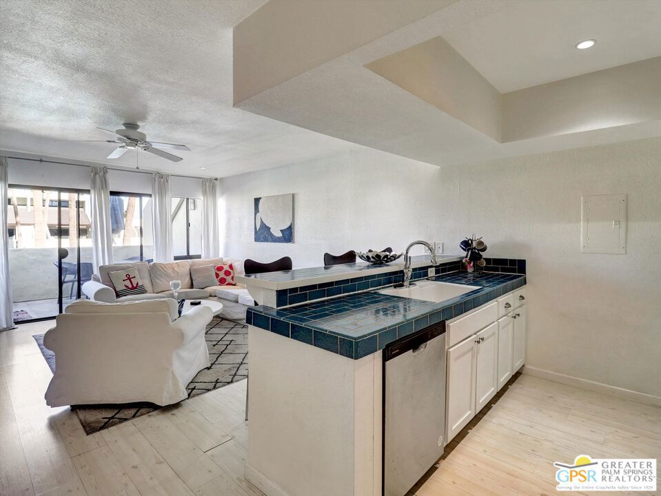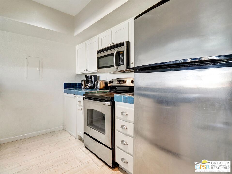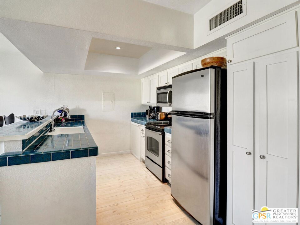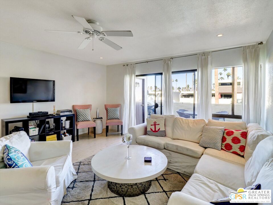 Wind free location, bright and sunny 1 bedroom remodeled condo with views of the pool. This unit is also just steps to the pool/spa. The condo is fully turn key furnish and ready to move in ASAP. Complex is perfectly landscaped. Private patio for outside dinners, short walk to shopping and restaurants, minutes to downtown Palm Springs. Tennis/Pickle ball court dog park, central air/heat, community laundry area. Covered parking and plenty guest parking.
