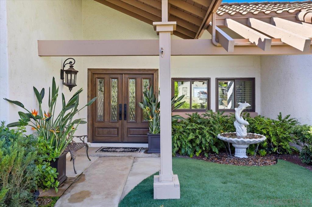 Welcome to this beautifully maintained, single-story home nestled in the wonderful StoneRidge neighborhood of North Poway. With its open floor plan, vaulted ceilings, and serene neutral palette throughout, this residence offers a perfect blend of comfort, style, and functionality. Abundant natural light floods every room, enhancing the warm and inviting atmosphere. Enjoy stunning mountain views from multiple vantage points and relax or entertain in two gorgeous patio areas, complete with designer pavers, elegant fountains, and custom uplighting. The main patio features a sleek Alumawood cover, providing shade and year-round enjoyment. Step into the welcoming front courtyard, then explore a thoughtfully designed interior featuring double-pane windows and sliding doors, leased solar panels for energy efficiency, and a spacious two-car garage with a built-in workshop area. The large primary suite includes sliding doors to the back patio, and spacious bathroom with a double vanity and walk-in shower. The two secondary bedrooms are situated on the opposite side of the home for added privacy. One serves as a perfect guest room near a full bathroom with a tub/shower combo, while the other is enhanced with built-ins, ideal for a home office or flexible third bedroom. (See Supplement!) The family room features a cozy gas/wood-burning fireplace, a charming breakfast nook adjacent to the kitchen, and sliding doors leading to the beautifully landscaped backyard. Outdoors, you’ll find a lush lawn, mature trees, and pristine landscaping. A winding pathway guides you to an expansive open area and a private gate that provides access to the phenomenal trail system in the adjacent The Farms development. This exceptional home offers a lifestyle of relaxed elegance, perfect for both everyday living and stylish entertaining.