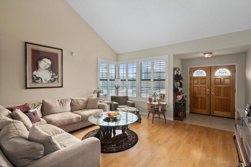 Beautiful views in the coveted Quail Gardens neighborhood! Tucked away on a quiet, tree-lined street, this bright and airy 4-bedroom, 2.5-bath home features a thoughtfully designed floor plan that encourages the best of indoor-outdoor living. Step inside to find a soaring vaulted ceiling and an open-concept living and dining area filled with natural light. A wall of large windows frames the surrounding greenery, bringing the outdoors in. The kitchen connects seamlessly between the living spaces, while the family room features a cozy fireplace and a convenient wet bar making it ideal for entertaining. A sliding glass door opens to the bonus sunroom, offering the perfect place to relax and enjoy the backyard year-round. Upstairs, the spacious primary suite includes a walk-in closet, double vanity, and a large walk-in shower. Down the hall, you’ll find three additional bedrooms, one of which enjoys private access to an oversized deck with sweeping views all the way to the Encinitas Ranch Golf Course. In addition to a wide driveway, this property boasts an attached 2-car garage for more parking or storage. Just a short drive to beaches, top-rated schools, shopping, dining, and more, don’t miss the opportunity to enjoy the quintessential Encinitas lifestyle!