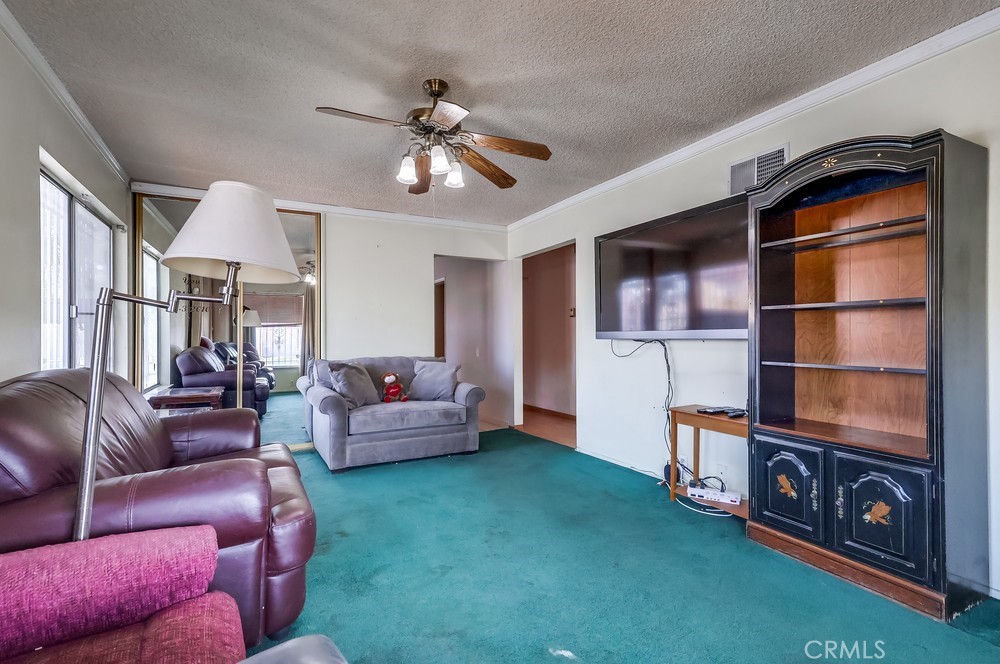 Welcome to 1721 Glenridge Circle, a spacious West Covina home with great potential and a versatile layout, ready to be reimagined into your dream residence. The exterior features a light gray finish with crisp white accents, with a driveway and walkway leading to the front entrance. Inside, the living room offers a comfortable gathering space with large windows and a ceiling fan, setting the tone for the home’s open layout. From here, one opening connects directly to the kitchen, while the other leads down a central hallway. The kitchen flows into a dining area with sliding glass doors opening to the backyard, and further into a cozy family room highlighted by vaulted ceilings and a bold red brick fireplace. The main hallway includes a spacious room with a walk-in closet (flexible as a bedroom or office), another secondary bedroom with storage and a ceiling fan, and a full bathroom. At the end of the hall, a separate vanity area connects to an additional bathroom and a third bedroom featuring vaulted beam ceilings. A large attached garage is also accessible from this hallway, providing ample storage and utility space. Out back, the wraparound yard offers a mix of paved and landscaped areas, including space for outdoor dining or grilling, a small storage shed, and shade provided by mature trees just beyond the property line. With its generous layout, multiple living spaces, and inviting outdoor areas, 1721 Glenridge Circle presents a fantastic opportunity for customization in a desirable West Covina neighborhood.
