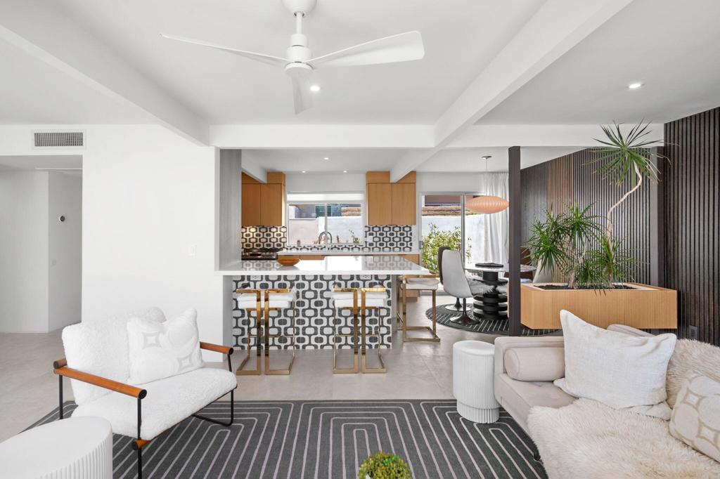 1740 N Via Miraleste is a striking mid-century modern condo reimagined with stunning contemporary flair. Featured during the 2024 Modernism Week, this show-stopping home instantly captured attention with its thoughtful design and high-end finishes.This hidden gem has been completely renovated from the ground up, with the transformation completed in December 2023. Every system has been updated for peace of mind — including newer plumbing, electrical, ductwork, double-pane windows and sliders, a newer electrical panel, tankless water heater, and a newer HVAC unit.Step inside to find a sophisticated blend of clean modern lines and timeless mid-century character. Highlights include custom acoustic wood wall treatments, a one-of-a-kind floating planter, paneled high-end appliances, and a sleek induction cooktop. Thoughtful soundproofing in the walls and ceilings offers serenity and privacy throughout the home.The bathrooms are outfitted with luxurious Kohler ‘Components’ fixtures and wall-mounted faucets, while the kitchen and baths are finished with custom rift white oak cabinetry. Additional design touches–like George Nelson lighting, a bronze mirrored bar, and playful penny tile accents–add a sense of authenticity and style.The open floor plan is bathed in natural light, with three patios that extend your living space outdoors and capture the desert’s indoor-outdoor lifestyle. Enjoy resort-style amenities including two community pools, a spa, and breathtaking views of Mt. San Jacinto.Offered turnkey furnished, this residence is a rare blend of architectural pedigree and modern luxury–ready to enjoy or showcase from day one.
