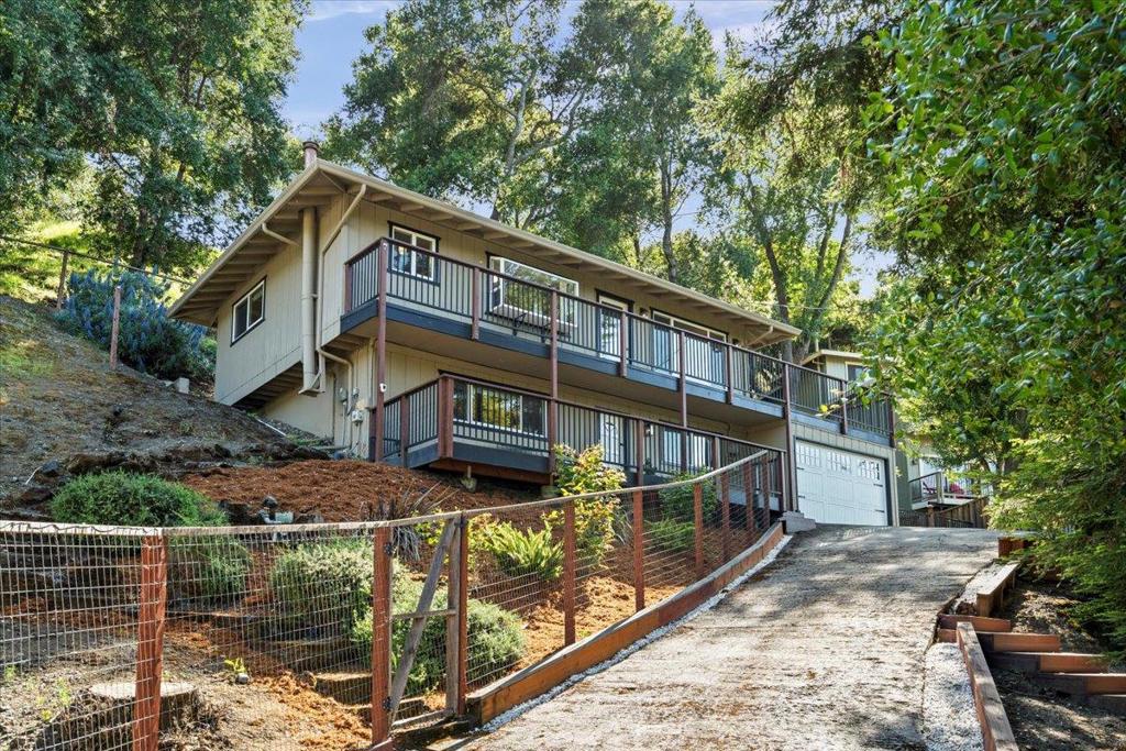 Your chance to be in lovely Holiday Lake Estates in a secluded sanctuary. the property has filtered views of the lake, green hillside views and lovely redwood trees. Lots of parking has been provided at the base of the lot. This home features an updated kitchen with quartz counters, stainless appliances (including the refrigerator), hardwood floors and a garden window. The great room has lovely views, warm fireplace and a newer “mini-split”heater and A/C unit to keep the area comfortable. A French door and slider both provide access to a wrap around “Trex-like” synthetic deck taking advantage of the views. A convenient Sonesta retractable canopy extends over the deck to provide shade and coziness when desired. The primary suite has a stall shower, updated vanity and bright walk in closet. A second upstairs bedroom also has a full updated bath and shower over tub nearby, for a potential second master. The garage has a carriage style roll up door, auto opener, cabinets and space for storage. A thoughtful fenced yard area of artificial turf is flat and usable. The home is bright with new light fixtures. Portions of the yard are fenced for deer protection. Dual pane windows and mirrored closet doors are additional desirable features of this special home