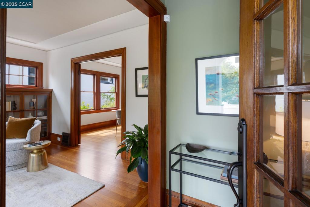 Timeless character meets walkable convenience in this beautifully preserved 1924 craftsman home. Ideally located on one of Alameda’s rare closed thru streets, that is peaceful and private. Step inside to gleaming original hardwood floors, rich in warmth and detail. The inviting formal living room features a classic wood-burning fireplace, surrounded by built-in cabinetry and wood-framed windows that flood the space with natural light. Entertain in style in the formal dining room, accented with original moldings and built-ins, offering a perfect blend of charm and function. The layout flows seamlessly into a thoughtfully designed kitchen with breakfast nook & garden window. This home showcases the craftsmanship of its era, with built-in shelving, solid wood doors and period trim work throughout. Each detail speaks to the pride of ownership and quality rarely found in newer homes. Enjoy the calm and community feel where neighbors stroll and traffic stays away, yet you’re just minutes from Park Street dining, coffee shops, local markets and the shoreline. Outside, the backyard is a hidden gem, ideal for outdoor dining, gardening, or relaxing under the trees. Step down into a surprisingly expansive basement-level garage with an extended depth that runs the length of the home.