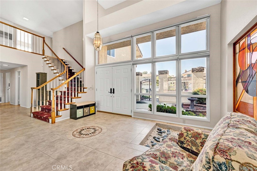 Enter the gated front courtyard to the gracious double door entry*The first impression of this home is the light bright décor & soaring ceilings w/the stunning views beyond*The formal living room is accented by elegant fireplace & is adjacent to the formal dining room*Remodeled kitchen is gorgeous w/custom wood cabinetry, large center island, granite counters, stainless appliances, recessed lighting, separate breakfast nook & views of the countryside*spacious family room has beautiful wood floors, wet bar, cozy fireplace & French doors to the yard*Downstairs bedroom has 3/4 bath, perfect for guests, office, or downstairs living* Master suite is showcased by soaring ceilings, fireplace, private balcony, wood floors & fabulous views! the remodeled bath has elegant tile in tub & shower & clear glass shower doors*Remodeled baths have granite countertops*Bonus room offers vaulted ceiling, wood floors and can easily become two more bedrooms*Covered patio is perfect for enjoying the expansive views Amenities include 3 car garage, clerestory windows, mirrored wardrobe doors, concrete tile roof, newer dual ac units & newer dual heating units, extra wide staircase. This home is meticulous maintained and features one bedroom down with private 3/4 bathroom and 3 bedrooms up and a large game room which can be converted to a 5th bedroom or 5th & 6th bedroom. Features include a full security system with cameras inside and out. Easy access to freeways, shopping, Peters Canyon, and horse trails. If you are looking for a view home you must put this one on your list.