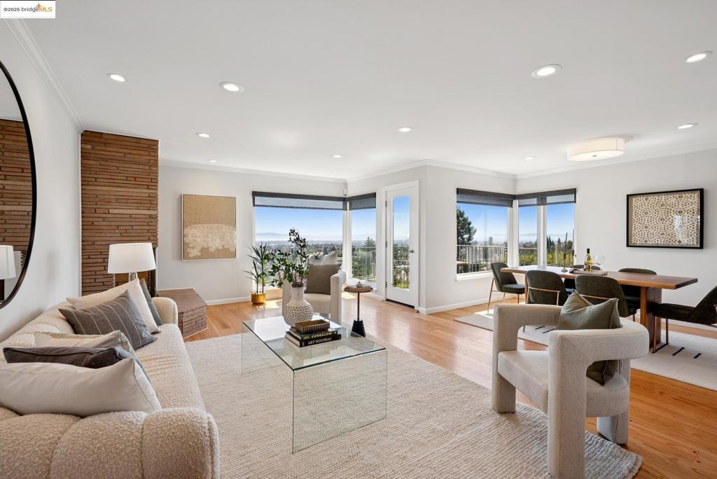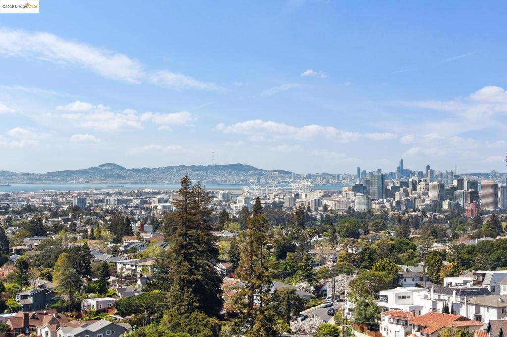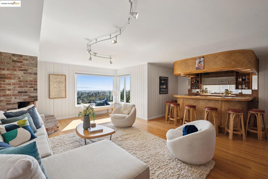 Wow home with amazing views! Fabulous & Spacious Level-in 5BR/3BA mid-century gem in coveted Oakmore with jaw-dropping Bay, bridge & city views! Tucked at the end of a serene cul-de-sac, this rare beauty offers no-step entry from both garage & front door. Bright & airy main level features 3BR/2BA, a gorgeous living room with floor-to-ceiling windows & mid-century fireplace, open dining with a view, a granite island kitchen with gleaming wood floors, stainless appliances & ample storage. Dreamy view deck off the living/dining area. Downstairs find 2 more bedrooms, full bath, a spacious family room with built-in Tiki Bar & 2nd fireplace, plus workshop/storage space. Outdoors, enjoy a private backyard retreat with patio, fruit trees, grape arbor & hot tub with deck surround. The private front patio is a lush & lovely delight. Stay cool with A/C! Stay charged, too- 2-car garage w/EV charger. Minutes to shops, dining, parks & schools — an entertainer’s paradise with unbeatable views & level-in convenience!