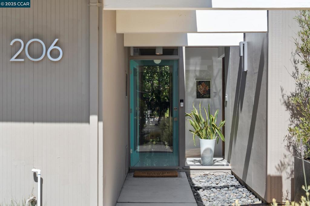 This bright, turn-key Eichler will win you over the moment you enter with walls of glass, natural light, and incredible upgrades throughout. The show stopping kitchen features Bosch appliances, an induction range, convection oven, built-in refrigerator and dishwasher, drawer microwave, custom walnut cabinetry, quartz waterfall island, and pull-out pantry. Iconic tongue-and-groove ceilings and globe lighting highlight the open kitchen and living room in true Eichler character. In the primary suite, enjoy custom California Closets with integrated lighting. Both bathrooms updated— the primary with quartz counters and Kohler vanity, the expanded hall bath with custom cabinetry and an enamel tub. Other highlights: solid core doors, Baldwin hardware, resurfaced drywall, and custom walnut hallway cabinets for extra storage. True comfort with radiant heating to warm your toes, A/C, an upgraded electrical panel, epoxy garage floors, and large-format Porcelanosa tile. The landscaped yard offers smart irrigation, DG paths, turf, apple, olive, and redwood trees, a tranquil fountain, and raised veggie beds. A detached office with mini-split, keypad entry, and smart lighting creates the perfect flex space. Relax in the hot tub and enjoy the best of California indoor-outdoor living!
