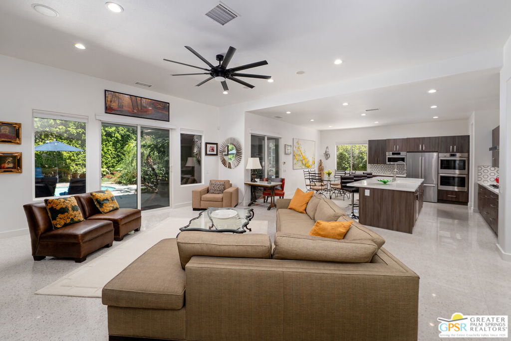 REDUCED PRICE! Enormous beautifully renovated 3 bedroom home with separate 1 bed/1 bath GUEST HOUSE in Palm Springs. The Guest House features a separate private walkway, gate and entrance as well as a full kitchen and washer/dryer. Built in 2004, this home has been lovingly maintained and upgraded. The large terrazzo tile flooring extends throughout the entire home. The spacious open floor plan brings the kitchen, living room and dining room together for inclusion for all. This home is spacious and boasts an open kitchen that flows into the great room, which is anchored by a fireplace and tempting views of the private pool/spa area. The large gourmet cook’s kitchen includes an large central island with counter seating, Butler’s pantry/coffee station, dry goods pantry, Bosch appliances, gas cooktop and modern tile backsplash. The primary suite is EXPANSIVE with a full office/private living room/media room attached at the back. With a small change, this room could even be a 5th bedroom or 2nd casita as it has it’s own private entrance. The primary bath includes a stand alone tub, large shower, dual sink floating vanity, appropriately sized expansive mirror, separate water closet and walk-in closet with custom shelving. Two guest suites share the guest bath also with stunning dual sink vanity and matching impressive custom mirror. Views of the pool and spa can be seen from almost every room through dual pane windows and sliding doors. Energy efficiency was well considered with multiple AC zones, enhanced ceiling fans and 42 solar panels. Parking includes an oversized 2-car garage and a driveway with room for 3 cars. Other amenities include water conditioner system, outdoor shower, tankless water heater and a separate laundry room with upper and lower cabinets, sink, counter space and window with a mountain view. THE CASITA has a separate PRIVATE walkway and entrance. Inside, a bedroom, living room, stackable laundry, desk/dining table, kitchen with cabinets, counters, refrigerator, sink and disposal, gas range, oven and microwave. The owners have rented this casita out casually making about $20,000 per year income. Alternatively, live and use the casita while renting out the main house for even greater income. In the back yard, the pool and spa with waterfall takes the main focus. Don’t miss the hardline gas grill, outdoor shower, pet friendly grass areas and entertainment area for outdoor table tennis and games. The versatility of the homes features will make you feel at home immediately upon arrival. On land that you own. No HOA. Solar system includes 42 panels w 13.73kW.