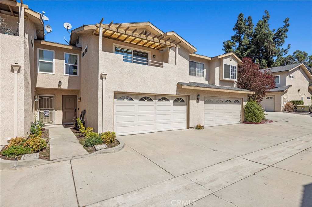 Welcome to this beautifully updated townhouse tucked inside a quiet gated community of just 15 units in Pomona. Offering 1,299 sq ft of living space, this home features 3 bedrooms and 2.5 bathrooms with a bright, open layout. The spacious living room is highlighted by vaulted ceilings, skylights, and a charming gas fireplace, flowing effortlessly to a private patio ideal for outdoor dining or relaxing. The kitchen provides generous cabinet space and a breakfast bar that opens to the dining area. A convenient powder room is located on the main floor for guests. Laminate flooring runs throughout the main living areas and upstairs hallway, with cozy carpet in the primary bedroom and one guest room for added comfort, while the second guest room features matching laminate flooring. Upstairs, the spacious primary suite includes a walk-in closet and a private balcony retreat, perfect for enjoying morning coffee or evening sunsets. A two car garage with side door access and a block walled yard with side gate add convenience. Residents enjoy a community pool with covered seating and restrooms. Located near the 10, 210, 71, 57, and 60 freeways, this property offers easy access to shopping, dining, and entertainment. Ideal as a primary residence or investment, this home is ready for you.