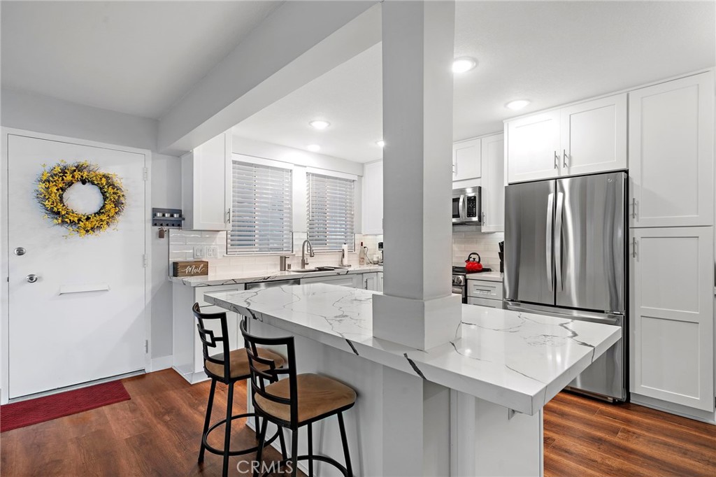 Beautifully upgraded 2-bedroom, 2-bathroom downstairs home offering true single-level living with no stairs or steps. This thoughtfully redesigned coop features an open-concept floor plan created by removing the wall between the kitchen and living room, enhancing natural light and creating a seamless flow for everyday living and entertaining. The highly upgraded kitchen is a standout, showcasing a spacious center island, elegant quartz countertops, updated white cabinetry, stainless top of the line appliances and recessed lighting. Wood-look flooring runs throughout the home, providing both style and durability. Enjoy year-round comfort with an efficient mini-split A/C and heating system with units in the living room and in each bedroom plus the convenience of inside laundry. Both bedrooms are well-proportioned, and two full bathrooms offer flexibility and privacy. The en suite primary bathroom has been upgraded with elegant quartz countertops, a custom-designed shower and modern fixtures. Enjoy the beautiful Southern California weather on your private patio. Move-in ready and beautifully updated, this home combines accessibility, modern finishes, and functional design in one exceptional opportunity. SOME OF THE MANY FEATURES INCLUDE: REMODELED KITCHEN – OPEN FLOOR PLAN – KITCHEN ISLAND – QUARTZ COUNTER TOPS – WHITE CABINETS – STAINLESS HIGH END APPLIANCES – MINI SPLIT A/C and HEATING SYSTEM WITH 3 UNITS – WOOD LOOK FLOORING – NO STAIRS – NO STEPS – INSIDE LAUNDRY – SMOOTH CEILINGS – DOUBLE PANE WINDOWS – REMODELED PRIMARY BATHROOM. This home is conveniently located close to Clubhouse 1 and Gate 1. Laguna Woods is one of the most prestigious age 55 and over communities in the US. In Laguna Woods you have access to: bus system around the community & to area shopping, restaurants, medical facilities; 5 pools & 4 hot tubs; golf, tennis, library, 7 clubhouse, a multitude of clubs, 3 fitness centers, theater, horse back riding/stables, garden centers, pickle ball, basketball, card rooms, billiards, bocce ball & more!
