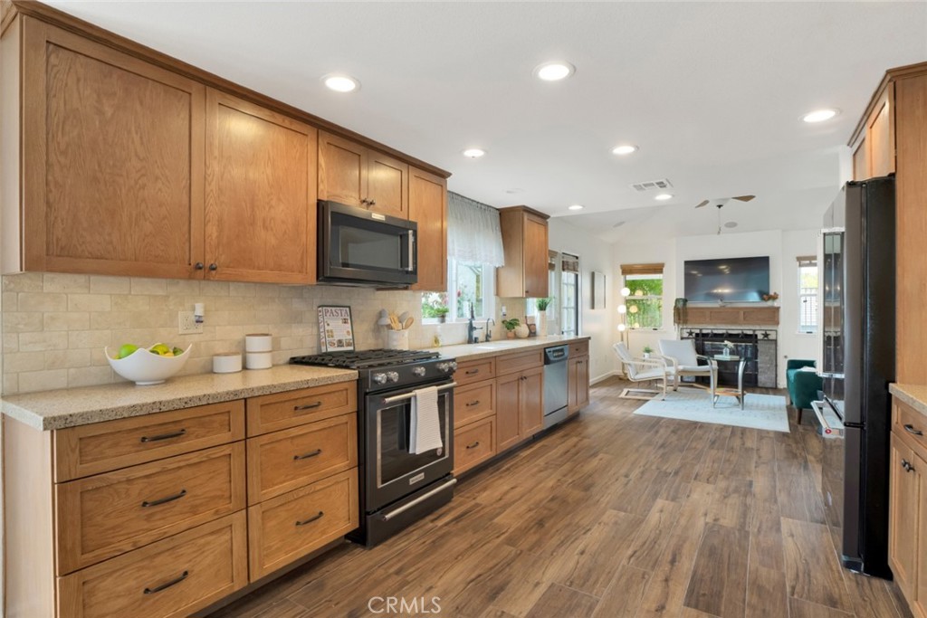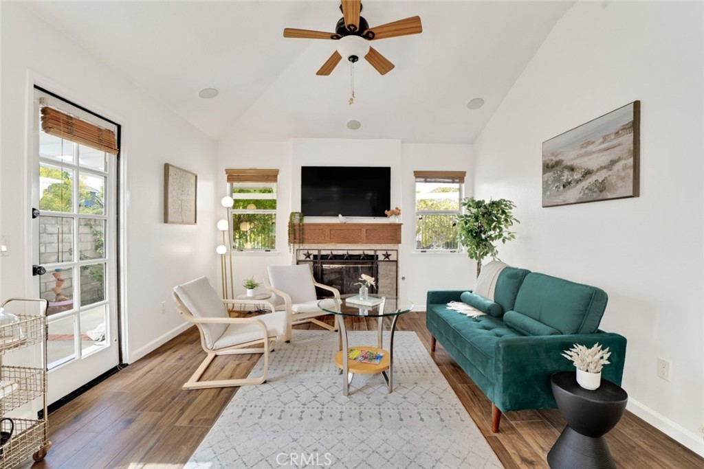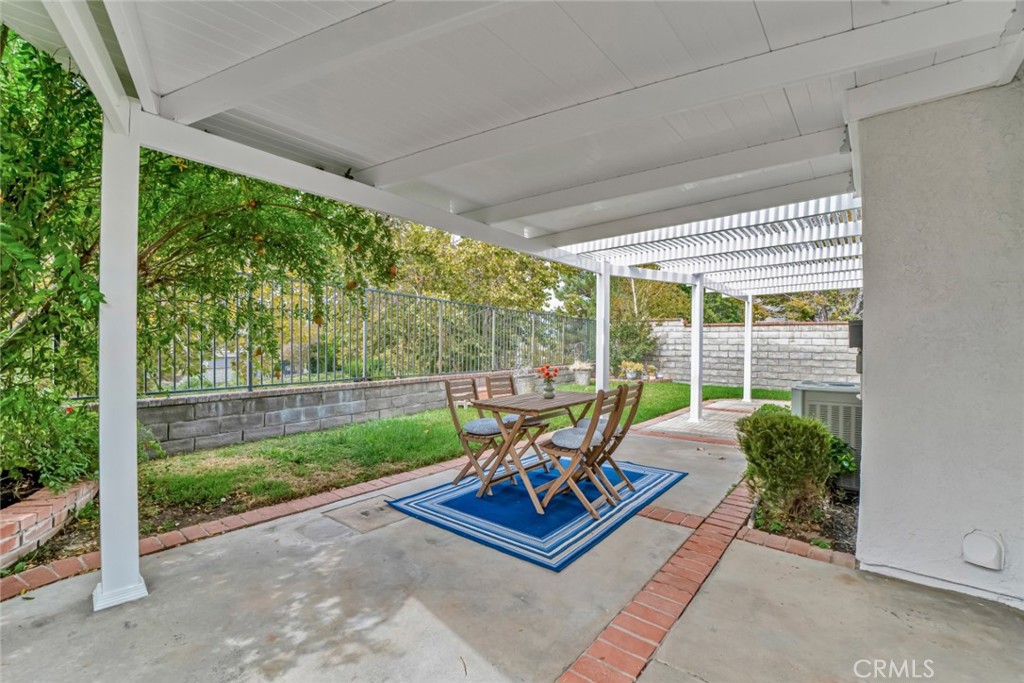 Welcome to this charming single-story home in the highly desirable San Marino tract of Valencia Summit. Set in a community known for its multiple pools, clubhouse, tennis courts, and access to paseos, trails, and CalArts University, this property combines lifestyle and location. Inside, the open floorplan features durable ceramic tile floors that mimic the warmth of hardwood. The step-down living room with double doors opens to a welcoming front patio, while the formal dining area provides the perfect space for entertaining. The remodeled kitchen shines with custom cabinetry and top-quality appliances, flowing seamlessly into the family room with its cozy fireplace and views of the backyard. The home offers three bedrooms, including a spacious primary suite with high ceilings, sitting area, walk-in closet, and private courtyard. The updated primary bath includes a custom-tiled step-in shower. Outdoors, enjoy a covered patio with pergola, a garden area, and an attached 2-car garage with direct home access. This beautifully maintained property offers comfort, convenience, low HOA fees, and the sought-after Valencia lifestyle