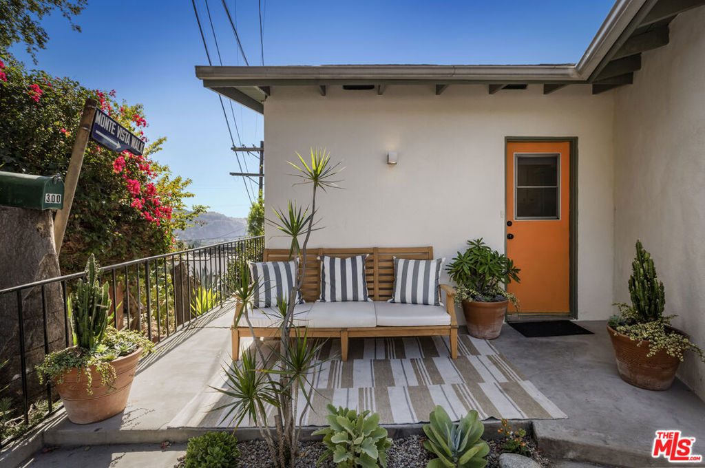 Located at the top of Mount Angelus, one of Highland Park’s most coveted enclaves, this captivating c1957 Mid-Century modern home offers superb original details, endless natural sunlight, spectacular downtown skyline views, and total privacy; ensconced among tall trees on a street to street lot and feels like you have no neighbors. Enter the property from the end of the cul-de-sac at the peak of the hill on Wayland St, where there is a 2 car garage and two entrances at street level. (La Follette Drive is below the property.) Front walkway leads to main entrance and large living room with stunning character fireplace and hearth, original hardwood floors, ample dining area and spacious walk-out balcony with panoramic 180 views of greenery, architecture, and the hills– capped by the downtown LA skyscape. Kitchen with separate entrance offers new cork floors, new appliances and cool vintage cabinetry. Featuring hardwood floors and large windows framing breathtaking views, the primary suite is spacious and private. The lower level features a large family room with abundant custom shelving from HP’s Matters of Space, and two exterior entrances: one entrance to the side stairs; plus sliders opening to large deck and yard/garden–perfect for outdoor entertaining. Built-ins; ironwork, magnesite stairs, original doors and many other details give this beautiful home a true classic feel. Large laundry and utility room also opens to the outside. Explore endless local eateries like Bub and Grandmas and Joy; and walk to rec center, music venues and theaters. Feel space, privacy and nature with the city at your fingertips: centrally located to downtown, Pasadena and Glendale.