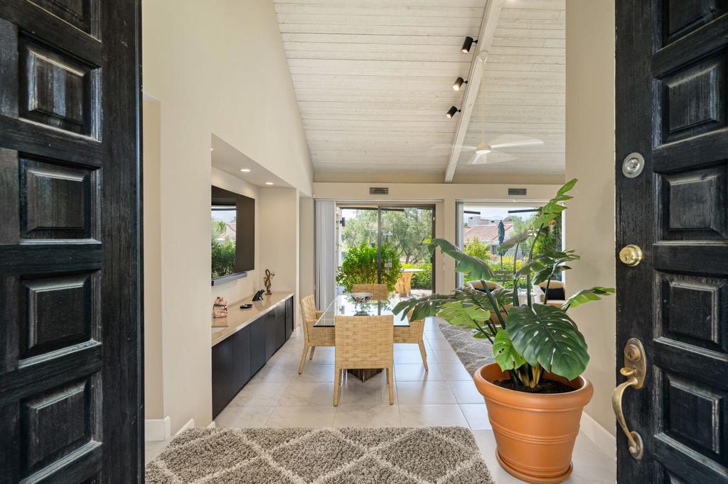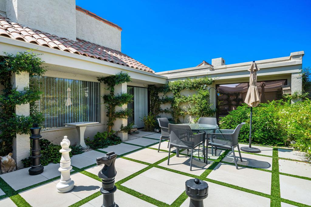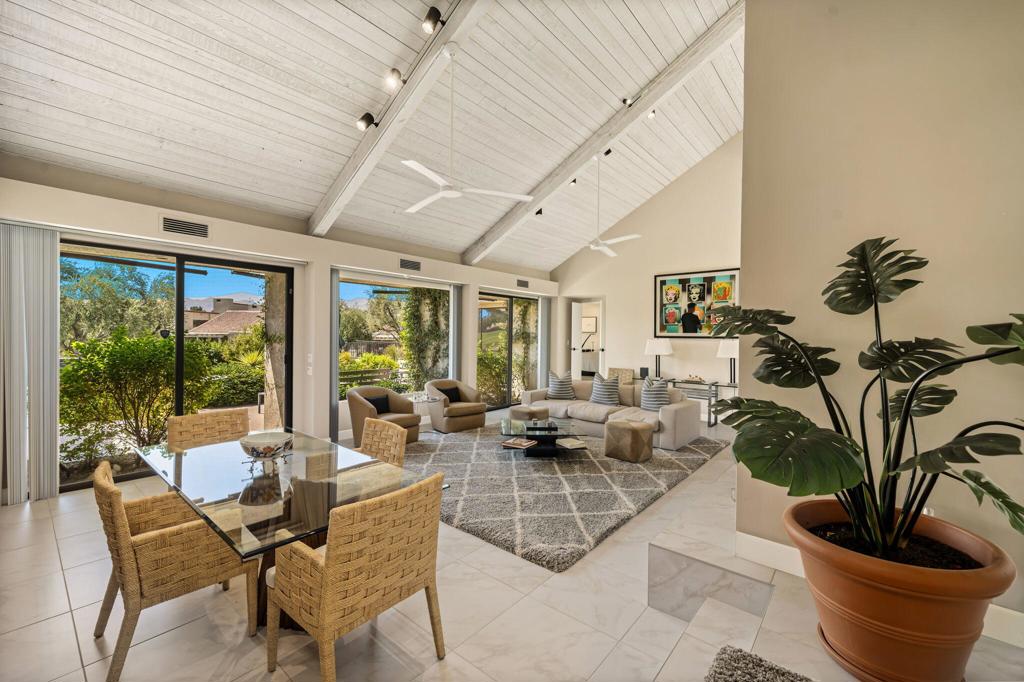 Rare end unit with spectacular south-facing views of two lakes, the Tournament Course, and the mountains! Beautifully renovated, this spacious 3-bedroom, 3-bathroom home offers 3,066 square feet of stylish living space.The living area strikes the perfect balance of modern sophistication and relaxed comfort. Soaring vaulted ceilings with whitewashed beams and expansive windows fill the space with natural light, framing sweeping views of the lakes, mountains, and lush greenery. Anchored by a sleek contemporary fireplace, the open layout is ideal for both entertaining and everyday living. Sliding glass doors extend the living space outdoors, blending indoor comfort with year-round enjoyment of the stunning surroundings.The kitchen is both functional and elegant, designed with rich dark cabinetry, light quartz countertops, and a large center island with bar seating for 6. Perfect for casual dining or entertaining, it features newer stainless steel appliances, including a double oven and French-door refrigerator. Ample storage, expansive counter space, and glass-front upper cabinets add both convenience and style. The open-concept design seamlessly connects the kitchen to the dining and living areas, while large windows and sliding doors highlight the incredible views.The primary bathroom is a private sanctuary, featuring a spacious walk-in shower with sleek glass doors, white tile, and matte black fixtures. Built-in shelving and a bench add comfort, while the expansive vanity with rich wood cabinetry and quartz countertops offers both beauty and functionality. Mirrored closet doors enhance the natural light and provide generous storage.The guest bathroom is equally refined, with a quartz countertop, dark cabinetry, and matte black fixtures. A frameless glass shower with sliding doors creates an open, airy feel, while marble-look flooring, neutral tones, and contemporary lighting add a touch of luxury.Located not far from the pool area with breathtaking views of the renowned Dinah Shore Tournament Course, this Mission Hills property is truly one-of-a-kind. HOA fees include front yard maintenance, gated security, cable TV, internet, community pool access, and more. The land lease has been extended to 2121.This exceptional home combines modern updates, timeless design, and unmatched views–an opportunity not to be missed.