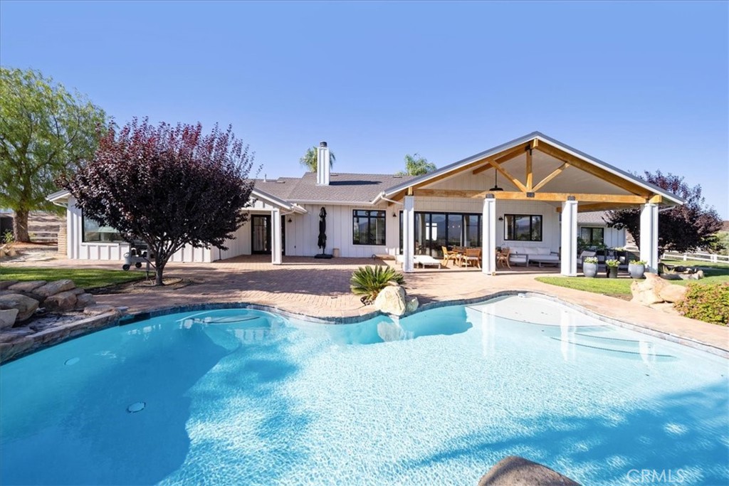 Welcome to 36644 Summitville Street, a stunning single-story estate in the heart of Temecula’s wine country. This beautifully remodeled home offers 3,317 square feet of living space with 4 bedrooms, 3.5 bathrooms, and soaring 10-foot ceilings throughout the main areas. Designed with both comfort and function in mind, the open layout is enhanced by custom high-end glasswork, natural wood beam details, and seamless indoor-outdoor living. At the heart of this remarkable home is a kitchen designed to impress both in style and function. Featuring a stunning Lacanche range as its centerpiece, the space is complemented by custom quartz countertops and dual islands that create the perfect blend of beauty and practicality. A Nanawall collapsible sliding door ads an amazing indoor/outdoor feel. Wide plank, wire-brushed wood flooring brings warmth and character, while a seamlessly integrated hidden refrigerator maintains a clean and refined aesthetic. Every detail has been thoughtfully curated, making this kitchen a true showpiece for both everyday living and entertaining. Set on nearly 5 fully fenced acres, the property provides exceptional amenities and endless potential. A sparkling pool and spa are complemented by a covered patio and private master retreat opening directly to the backyard. Car collectors and hobbyists will appreciate the impressive 1,550 sq ft detached garage with oversized roll-up doors, along with a 2,200 sq ft barn offering space for up to 8 vehicles plus a central pull-through. Both structures feature approximately 12-foot doors and connect seamlessly to the residence by a paved drive. The home was thoughtfully renovated in 2020, with every detail carefully crafted. Everything new including all windows and doors. Additional features include paid for solar (with NEW Tesla inverters,) gated entry, an attached oversized 2 car garage, modern farmhouse architecture, and flat, developable areas ideal for expansion, equestrian use, or creating your dream vineyard. Surrounded by well-maintained neighboring estates, this property combines privacy, functionality, and prestige in one of Temecula’s most desirable settings. Extra Bonus – 220 plug for EV charging in the garage! This is a rare opportunity to own a versatile wine country retreat with unmatched garage and barn facilities, just minutes from world-class wineries, dining, and shopping. Book your private tour today.
