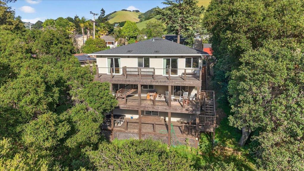 Contemporary three-story home in Fremont’s Canyon Heights neighborhood, perched in the Niles hills with sweeping views of the surrounding hillsides and tree canopy. Understated street presence gives way to a sophisticated interior that belies the scale and quality within. Fully reimagined in 2017, the open-concept main level features wide plank hardwood floors and walls of windows that bring the outdoors in from multiple exposures. The open chef’s kitchen is anchored by a large center island with bar seating, quartz countertops, white shaker cabinets, stainless steel appliances, stone backsplash, and pendant lighting. A fireplace anchors the main living area. The primary suite is generously scaled with dual vanities. A finished lower level of approximately 800 square feet, reflected in county records, provides flexible space for a media room, home gym, or guest accommodations. Across multiple levels, 1,360 square feet of decks step down the hillside and frame unobstructed views of the canyon and hills. Roof and HVAC both replaced in 2017. Minutes from Niles Canyon Road and Alameda Creek Regional Trail. Downtown Niles is walkable with a Saturday farmers market, antique shops, and local dining. Buyers to verify school enrollment eligibility with Fremont Unified.