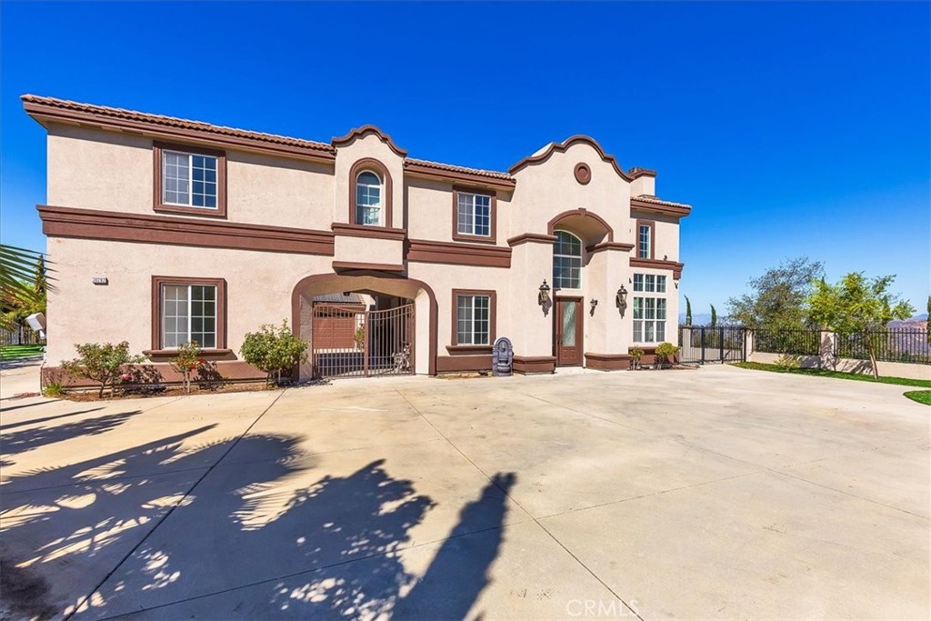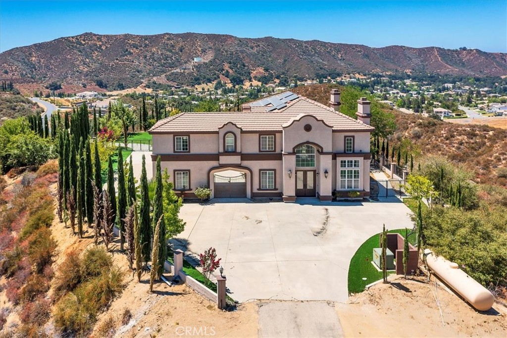 Welcome to 39292 Butterfly Drive, a custom estate perched on nearly 5 acres in the prestigious gated community of Wildwood Highlands. Nestled near Wildwood State Park and just minutes from Oak Glen’s wineries and apple orchards, this home combines timeless elegance with breathtaking surroundings. A grand porte cochere and double-door entry set the stage for the dramatic foyer, complete with soaring ceilings and a dazzling crystal chandelier. Real wood floors flow throughout the main level, where you’ll find an office, 1/2 bath, convenient laundry room with sink, and a detached guest room with its own private full bath, ideal for extended family, guests, or future ADU conversion. Upstairs, discover 4 bedrooms and 3 bathrooms, including the luxurious primary suite, a retreat featuring a private sitting area with fireplace, spa-like bath with soaking tub and glass shower, and an expansive deck showcasing panoramic valley views framed by snowcapped mountains. The gourmet kitchen is a chef’s dream with a large island, granite counters, GE Monogram appliances, six-burner gas range with hood, double ovens, trash compactor, and a spacious walk-in pantry. Three fireplaces add warmth throughout, while the finished 3-car garage impresses with epoxy flooring and insulated doors. Outdoors, enjoy the fully fenced yard lined with Italian Cypress, mature fruit trees, low-maintenance artificial turf, and a large covered patio with ceiling fans. A private covered observation area is perfect for gatherings or a future outdoor kitchen. Energy efficiency abounds with 61 paid-off solar panels, 3 Tesla chargers, and 2 backup batteries—no leases, loans, or PPAs. With stunning views from nearly every window, this home offers sophistication, comfort, and sustainability in an unmatched setting.
