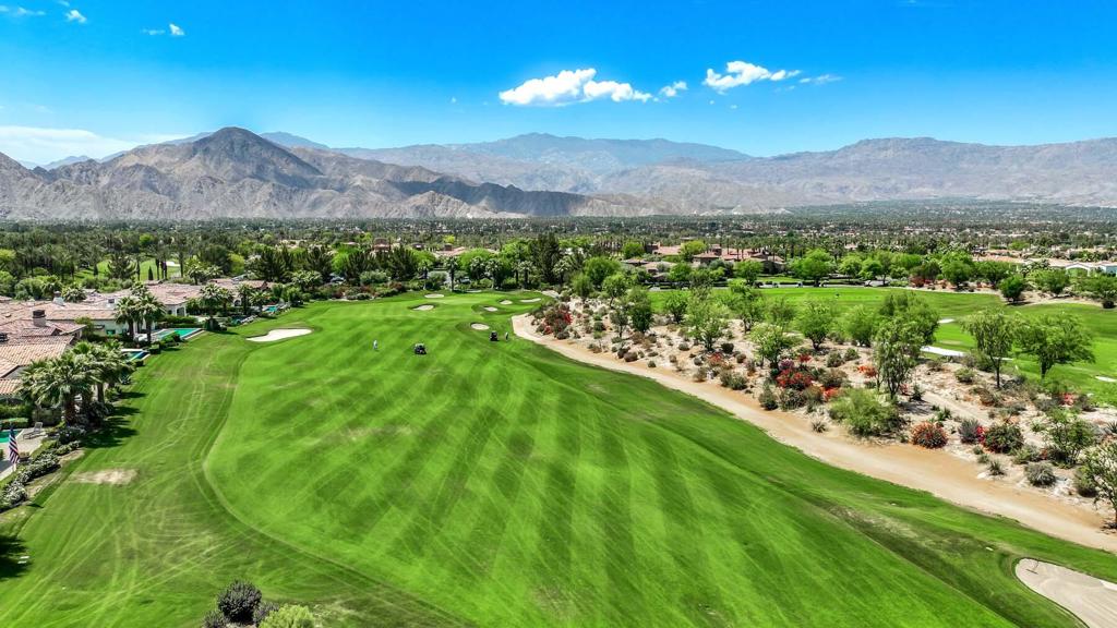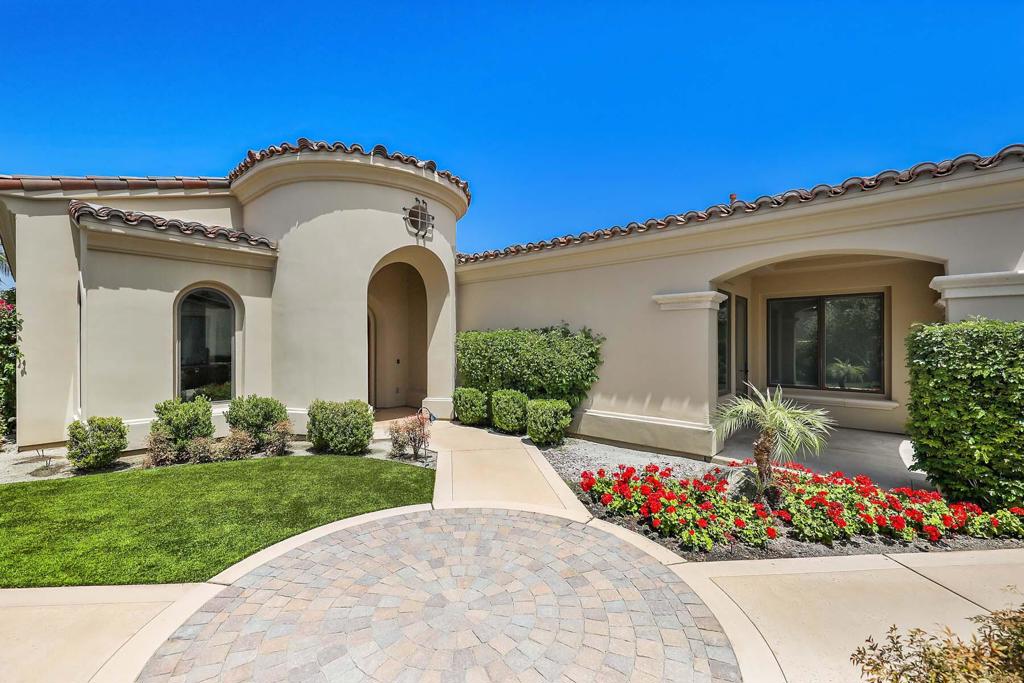 Inside Toscana Country Club, this beautiful home sits on an oversized, cul-de-sac lot close to Club amenities and offers over 3,300 sq.ft of desert living. With unobstructed west mountain views, this home features luxuries such as additional views of the Hole 9 fairway of the Jack Nicklaus Signature North Course; lush, mature landscaping for a private oasis feel; two sets of floor-to-ceiling pocket doors for indoor-outdoor living; three-sided wetbar with butted-glass for maximum views; outdoor built-in BBQ and bar; custom pool & spa; roll-down shade for the covered patio; and more.At the heart of the home, the light and bright greatroom with fireplace flows seamlessly into the kitchen and dining area, perfect for entertaining. The gourmet kitchen features ample cabinetry, granite countertops, island, peninsula with breakfast bar, and breakfast nook. Stainless steel SubZero Wolf appliances include double oven, refrigerator, and drop-in four-burner range with center griddle + hood.Relax in the primary suite that offers a sliding glass door to its own covered patio, and an en-suite showcasing a granite-surround soaking tub, separate sinks with spacious countertops and vanity, walk-in closet, and walk-in shower. Guests can retire to the secluded guest house complete with sitting area, built-in cabinetry, and en-suite bath. In the main home, two guest rooms are available: one was architecturally expanded an additional 125 sq.ft. to be used as a media and workout room.
