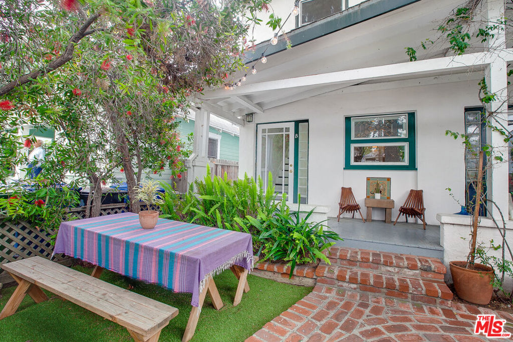 Nestled within a charming 1920s Rialto Craftsman 4-plex is a private, light-filled unit on the second floor that offers an inviting living space with 1 bedroom, 1 bathroom, an office, and a bright sunroom perfect for dining or relaxing with a good book. The unit is adorned with built-ins, stained glass, beveled mirrors, and features hardwood floors throughout. The kitchen boasts a travertine stone floor and Corian countertops. Residents can unwind in the shared garden patio and seating area, ideal for alfresco dining and relaxation. The property is conveniently located near the beach, Venice canals, and the vibrant Abbot Kinney shops and restaurants.