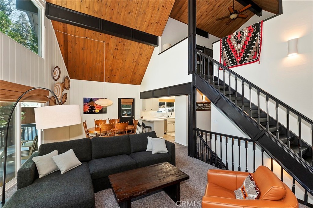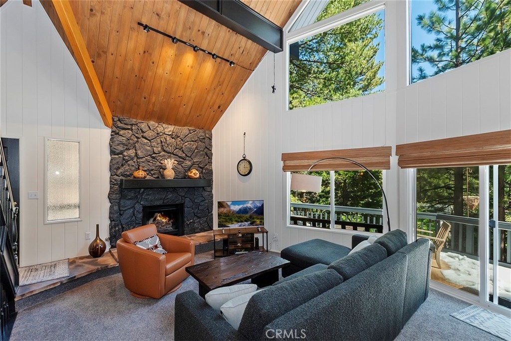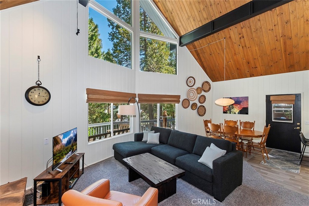 Huge price improvement! An absolutely stunning and turnkey 2 bed 2.5 bath house with large game-room that includes a pull out bed on the 1st floor and a queen pull out sofa on the main level allowing home to sleep 8 comfortably. This home is located in one of Lake Arrowhead’s premier neighborhoods and includes “Lake Rights” to private Lake Arrowhead. Homes of this quality rarely come on the market so don’t miss out on your chance to own this gem! Classic mountain “Prow Front” cabin with wall of windows to enjoy the surrounding trees and the “away from it all” feeling that greets you walking into this home. Lower level features spacious game room with custom wet bar, woodburning stove, half bath, laundry room and slider out to large covered deck to enjoy the serene setting. Main level has the open floorplan and soaring ceilings that is on everyone’s checklist. Living room opens to dining area and kitchen with breakfast bar, new flooring and stainless appliances. Main level also has spacious bedroom with mini split A/C and full bath. Outside on the main level you will find a large wrap around deck with a cozy lounge area and firepit, a 2nd sitting area and around the corner is the BBQ area and table for dining al fresco. Off of the deck to rear of property is a turfed area, fenced with French Drain. Upstairs is the primary retreat/loft with new carpet and vinyl flooring, pony walls for improved privacy, barn door entrance to updated ensuite bathroom and a mini split unit to keep you cool in the summer and warm in the winter. This truly turnkey property has been lovingly cared for and shows pride of ownership throughout. Detached 2 car garage and large driveway allow for plenty of parking.