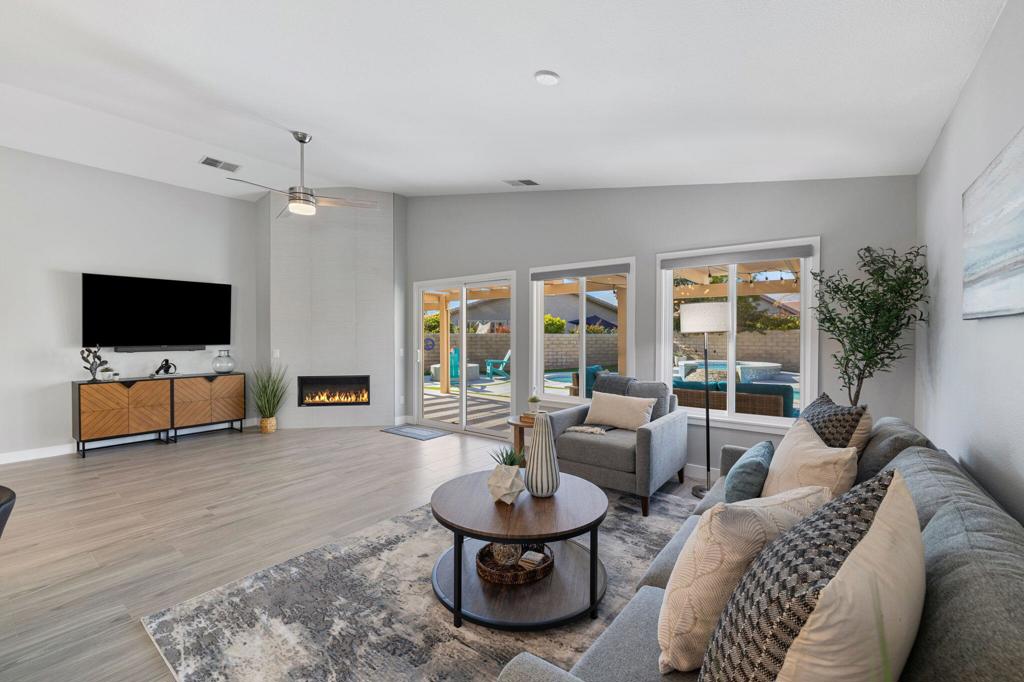 Sunshine is calling at this beautiful turnkey furnished 2 BR, 2 BA desert oasis nestled behind the gates of Indian Palms Country Club. Be greeted by desert sunlight & chic open living space that is perfect for entertaining or your personal desert retreat! Freshly remodelled, this stylishly furnished home offers the perfect blend of comfort & luxury for an unforgettable desert getaway. The fully-equipped kitchen boasts modern appliances, beverage fridge & everything you need to entice your culinary delight. Large center island with an attached dining area expands to the comfortably furnished living room with an ambient fireplace & sliding door to the backyard. Two spacious bedrooms with comfy bedding & chic remodelled bathrooms offer serenity after a long day of desert excitement. Endless relaxation awaits in the resort style backyard oasis where you will experience sun-drenched days relaxing by the sparkling pool & spa with tanning ledge or gathering for drinks around the swim up table with in pool seating. Spend starry nights around the firepit or dining al fresco. Indian Palms CC offers a 27 hole golf course, Clubhouse, restaurant, tennis courts, pickleball courts, bocce ball and a fitness center. Resort style living close to world-class golf, restaurants, shopping, Indian Wells Tennis Gardens, BNP Paribas Open & more. Walking distance to Empire Polo Grounds, Coachella & Stagecoach music festivals. Modern desert paradise awaits! Available Now! Rate Varies by month.