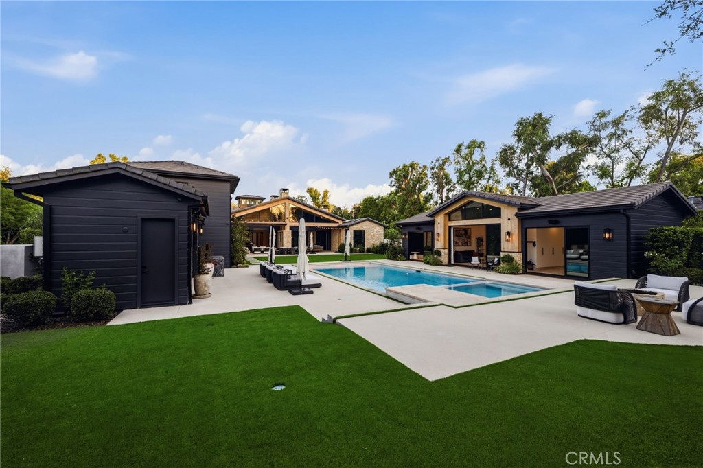 Welcome to this meticulously crafted single-story designer estate set within the prestigious guard-gated enclave of Hidden Hills, where timeless elegance meets modern sophistication. Impeccably curated with elevated finishes and thoughtful design throughout, this exceptional residence offers a seamless blend of luxury, comfort, and refined living. Designed for both grand entertaining and everyday ease, the open-concept layout is defined by soaring ceilings, wide-plank flooring, and walls of glass that flood the interiors with natural light. A formal dining room with a striking custom wine display creates a dramatic yet inviting setting, while the state-of-the-art media room delivers an elevated cinematic experience. The chef’s kitchen serves as the heart of the home, featuring top-tier appliances, bespoke cabinetry, expansive dual islands, and a generously sized walk-in pantry balancing beauty with exceptional functionality. The living spaces transition effortlessly to the outdoors, embracing the quintessential California indoor-outdoor lifestyle. A private casita-style suite, discreetly positioned above the main residence, offers a tranquil and secluded retreat ideal for guests, extended family, or a refined office space. Complementing the estate is a detached one-bedroom ADU complete with a dedicated gym, providing versatility for wellness, guest accommodations, or independent living. The primary suite is a true sanctuary, highlighted by a one-of-a-kind dual island walk-in closet and a spa-inspired bath designed to evoke a five-star resort experience. Indulge in luxurious finishes, a soaking tub, an expansive shower, and a calming ambiance curated for ultimate relaxation. Set within one of Los Angeles’ most exclusive communities, known for its privacy, security, and equestrian lifestyle, this extraordinary residence represents a rare offering where design, quality, and lifestyle converge at the highest level.