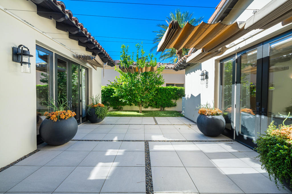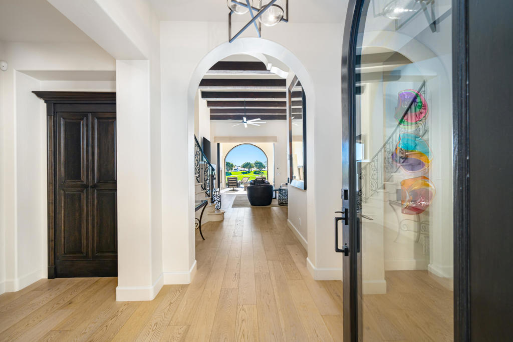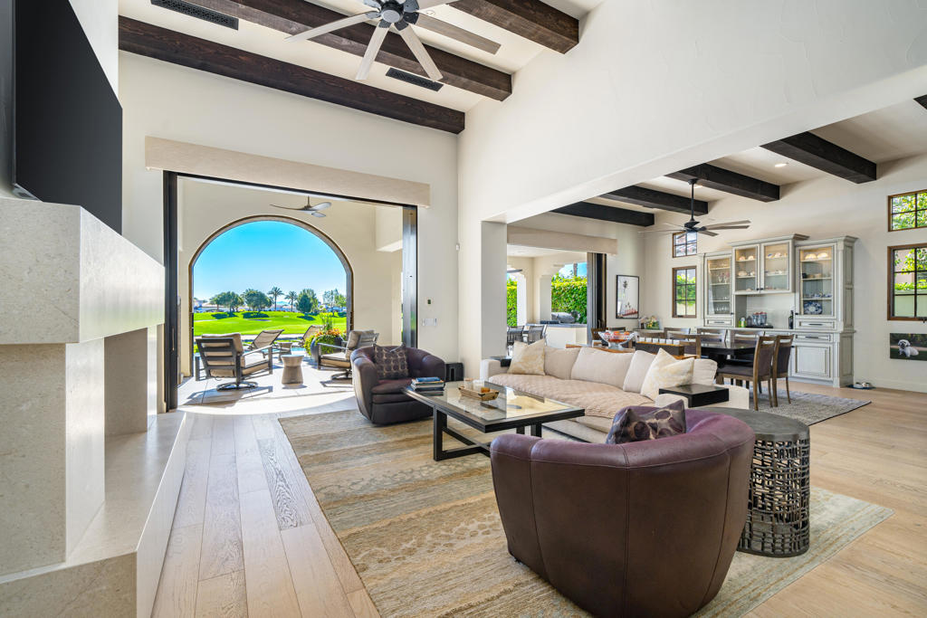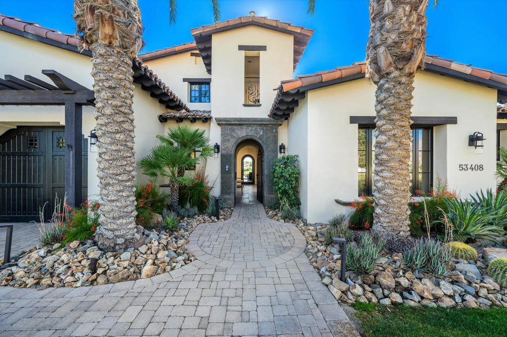 Nestled in a serene lakefront setting, this 5,056 sqft architectural masterpiece, boasts 5 bedrooms, 5.5 baths, 3 car-garage, and spectacular views of the 16th green of the prestigious Pete Dye Course. Upon entry, an inviting courtyard leads to a stately great room, adorned with warm natural wood flooring & an open floor plan that effortlessly integrates the living areas. The expansive pocketing doors merge indoor elegance with the beauty of the outdoors. An elegant staircase ascends to a spacious private guest retreat with dramatic Santa Rosa mountain views. The kitchen features rich wood cabinetry, state-of-the-art appliances, & a large natural stone island–perfect for both cooking & entertaining. The elegant dining room provides an intimate setting for both casual & formal gatherings. The primary retreat is a sanctuary of relaxation, featuring a cozy fireplace, comfortable seating area and a spa-like primary bath, complete with double vanities, a jetted tub, & the finest finishes. A spacious private casita offers a luxurious guest experience, overlooking the quaint courtyard along with western mountain views. The outdoor entertainment area is a paradise for relaxation & social gatherings, boasting an inviting infinity-edge pool, a raised spa, built-in BBQ island, & an outdoor fire pit that sets the stage or unforgettable starlight gatherings. This beautiful home is being offered furnished per inventory.