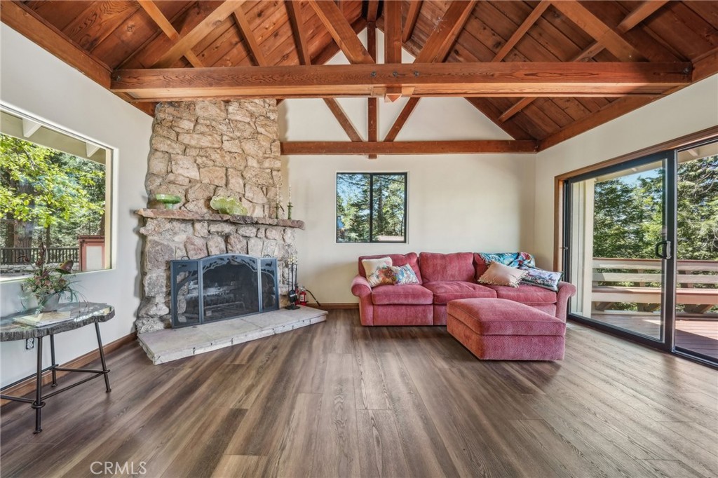 Offered for the first time in years, this timeless 1928 mountain lodge is nestled in the coveted enclave of Crest Estates—a private, storybook neighborhood where listings rarely surface. Tucked among towering pines, this home blends rich historic character with refined modern upgrades. The moment you enter, you’re greeted by soaring two-story trestle-beamed ceilings and a floor-to-ceiling rough-hewn granite fireplace that anchors the sun-drenched great room. Nearly every room—save the bathrooms—boasts sweeping panoramic views of Lake Arrowhead, stretching almost to the marina. The main level features a chef’s kitchen with brand-new, never-used appliances (still in protective wrap), custom cabinetry, and a statement powder room. A charming mid-stair window seat offers a moment of retreat with breathtaking views of both lake and forest. Upstairs, the primary suite reigns supreme with its own private balcony and open loft-style landing, creating a secluded sanctuary above it all. Downstairs, find a secondary bedroom and utility room with direct access to updated systems including FAU and a tankless water heater—plus space to add a bathroom. Outside, a fully renovated detached guest house provides studio-style luxury with its own lake views. While this property does not currently hold lake rights, consider pursuing them via an Arrowhead Woods lot purchase. In the meantime, you’ll enjoy a setting so private, serene, and visually commanding it barely seems real. This is not just a home—it’s a legacy opportunity. Properties like this whisper through the market. By the time you hear them, they’re already gone.