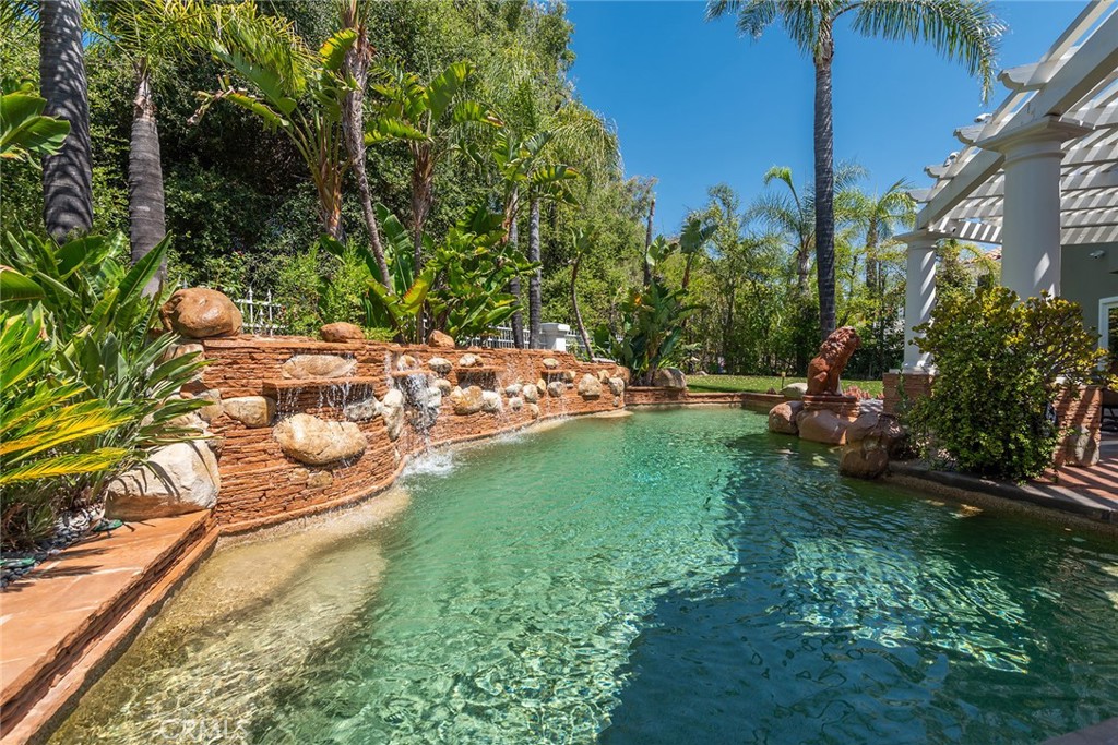 Major price reduction!!! Serious seller. In addition to being a gorgeous home this is an incredible value. Located in the exclusive guard gated community of Mountain View Estates this customized and expanded Plan 7, with 6868 sq. ft. of luxury living features 6 bedroom suites, including 2 primary suites and a 4 car garage. Bedrooms 5 & 6 are being used as a home theater and a large game room. Situated on a single loaded cul-de-sac street this property is meticulously maintained and offers gorgeous curb appeal. Inside is a dramatic 2 story entry featuring a wrought iron staircase, marble flooring & Murano glass chandelier. The family room offers custom built-in cabinets, hardwood floors, a wet bar, fireplace, & is open to the huge kitchen with grand size eating area, walk-in pantry, European cabinets, large center island & a butler’s pantry. The formal dining room has French doors to the beautiful side yard, a large crystal chandelier and built-in buffet cabinets. The formal living room has coffered ceilings, hardwood floors, a fireplace & crystal chandelier. The larger of the 2 primary suites features a fireplace, 2 large walk-in closets and a grand bathroom with spa tub, dual vanities and shower. The smaller primary suite offers 2 closets and a bathroom. There are 2 additional bedroom suites upstairs. Both downstairs bedrooms, one used as a home theater and the other as a game room have bathrooms and hardwood floors. The backyard offers a private verdant sanctuary with lush landscaping, a beach entry salt water pool with a large art sculpture, stone stacked and rock waterfalls and a separate spa. A barbeque area, covered patio and large artificial grassy lawn complete this tropical oasis. Additional amenities include 4 heating and air conditioning units, electric blinds, low maintenance “always green” artificial grass, water softner, a 4 car garage, and a “Tesla Virtual Power Plant” which works like a generator giving power for up to 82 hours when there is a power outage. Located in the award winning Las Virgenes School District, near restaurants, shopping and a short drive to Malibu beaches!