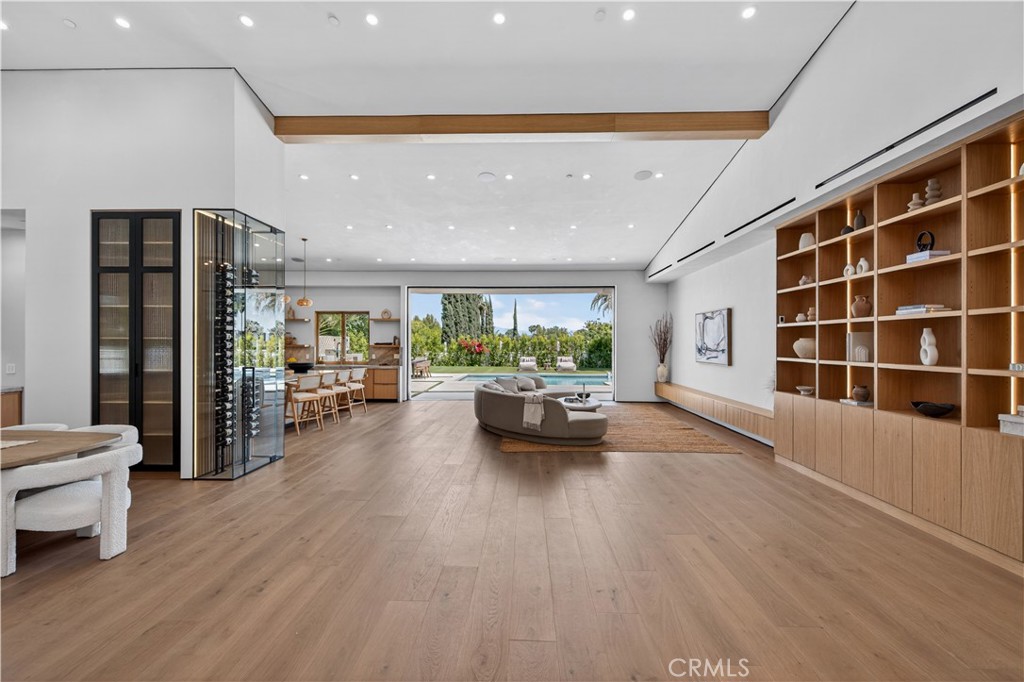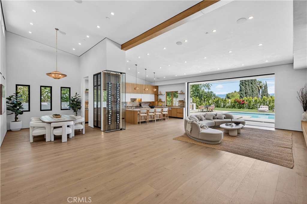 Experience elevated living in this single-story, 5en-suite-bedroom modern masterpiece. This custom re-imagined home is set on a large flat lot where design, comfort and emotion meet in perfect harmony. From the moment you arrive, a sense of calm takes over, as you effortlessly transition into a space defined by light, scale, and intention. Soaring ceilings, exposed beams, near-ceiling windows and pocket sliding doors invite the outdoors in, filling the home with a soft natural glow that evolves throughout the day. The great living room sets the tone, refined yet welcoming, with textured lime wash walls that add warmth and depth creating a grounded, serene atmosphere perfect for both quiet mornings and intimate evenings. At the heart of the home, the kitchen and great room serve as a natural gathering place. Taj stone countertops, an oversized island, and Thermador appliances anchor the space, while a stunning glass-enclosed wine room adds a dramatic focal point for everyday living or entertaining. All your family needs are met with additional custom spaces. A private office or guest room, wrapped in soft textures, offers a peaceful retreat for focus and creativity. The primary suite is a true sanctuary with direct outdoor access. The spa-like bath showcases Calcutta countertops and sculptural Kohler fixtures, blending artistry with indulgence. An additional en-suite bedroom also features private outdoor access, offering flexibility for guests or multigenerational living. All five bedrooms are thoughtfully designed with custom closets and refined finishes. Through pocket doors, indoor living opens to a resort-style backyard with a pool, waterfall spa, outdoor kitchen, fire pit, and elevated views, perfect for relaxed evenings and memorable gatherings. With a timeless smooth stucco exterior, this home is more than a residence, it is a feeling, where every detail invites you to live beautifully and with intention.
