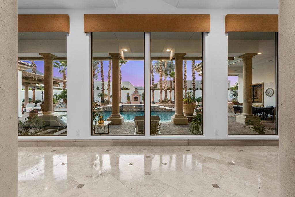 Newly refreshed, this contemporary mediterranean residence is gracefully situated on over half an acre within the exclusive gated custom home enclave of Lions Gate Estates in La Quinta. A recent outdoor transformation introduces a soft white exterior palette, desert contemporary landscaping, and artful exterior lighting, elevating the home’s architectural presence while framing panoramic mountain views and creating a resort caliber setting from sun-filled afternoons to evenings under the stars. Interiors reflect scale and refinement, with custom built-ins throughout, a formal living and dining room, and an inviting great room featuring a fireplace and wet bar, perfect for hosting with ease. A temperature controlled wine cellar and chef’s kitchen with granite slab countertops, premium appliances, and generous gathering space further underscore the home’s entertaining appeal. Designed to balance architectural elegance with everyday livability, the home unfolds across four-bedroom suites and four-and-a-half baths, including a private detached casita ideal for guests. The primary suite is a private sanctuary, complete with its own fireplace, dual walk-in closets, a soaking tub, and an adjoining exercise room. At the heart of the property, a Pebble Tec saltwater pool and spa, enhanced by an outdoor misting system, anchor the grounds and sets the tone for relaxed desert living. Covered patios, an outdoor fireplace, built-in BBQ, automated awnings, and thoughtfully curated lighting complete the elevated outdoor atmosphere. Additional amenities include a sauna and an air-conditioned three-car garage. Offered furnished per inventory. This estate presents a rare opportunity to experience desert living at its finest.