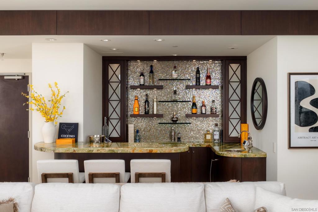 Welcome to Renaissance Penthouse Residence 2204, a recently renovated, top-floor, two-story home occupying the entire southern half of the building with over 2,400 sq. ft of private outdoor living space. This rare residence offers sweeping views with mountains to the east, Downtown and Coronado to the south, and expansive bay and ocean views to the west. Recent renovations include wide plank luxury vinyl flooring throughout the main living areas, plush new carpeting in the primary suite and office, smooth-finished walls, fresh paint, custom drapery, upgraded hardware, and a redesigned powder room. The home features multiple living and entertaining spaces, including formal living and dining areas, a family room with an Onyx stone wet bar and fireplace, a private office, and a 6-zone Sonos sound system. There is also the option to install an elevator. The primary suite offers a massive walk-in closet, a dedicated vanity area, and a spacious two-person shower. The kitchen is finished with Taj Mahal quartzite countertops and full-height backsplashes, a Wolf gas range, dual Sub-Zero frig/freezers, 2 sinks, and 2 dishwashers. Additional highlights include custom railings by artist Linda Joanoue, 3 hand-blown, Chihuly-inspired glass chandeliers, and a temperature-controlled 300+ bottle wine refrigerator. Designed for entertaining, this home can comfortably host over 150 guests. Offered with 3 parking spaces and 3 large storage lockers, this penthouse presents a rare opportunity to own a one-of-a-kind residence in the heart of Downtown.