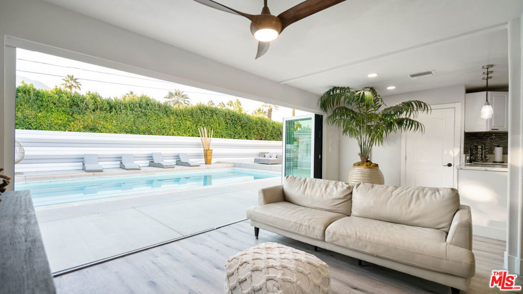 Incredible Opportunity, no HOA or Land Lease – you own the land. Owned Solar system! Short-term rental ok! Welcome to your desert sanctuary located just minutes from downtown Palm Springs in Demuth Park. This stunning fully furnished, turn-key home has been completely upgraded and remodeled offering a seamless blend of mid-century design and desert charm. The updates include a new kitchen, bathrooms and paint making it move-in ready! The open kitchen is a culinary haven, complete with new black and chrome appliances flowing into the living room which opens with huge sliding doors to the private back yard featuring a sparkling pool, expansive deck and and spa area – perfect for outdoor entertaining. Retreat to the luxurious master suite or two guest bedrooms, all with French doors opening to the outdoor oasis. The home also features a bonus room off the kitchen, perfect for a home office or gym. The detached air conditioned garage is an additional bonus space the could be used as a pool room. Featured on a large fenced and gated lot with ample parking and space for an RV. Located in a prime and tranquil neighborhood, close to the airport and all the sports activities Demuth Park has to offer including pickle ball, tennis, walking trail sand playgrounds. This is the perfect home for a successful vacation rental, primary residence or second home. Schedule your showing today and experience desert living at its finest.