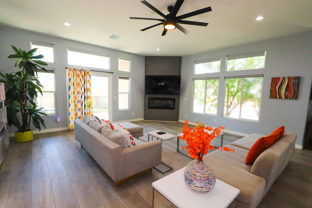This 3-bedroom, 2-bathroom beauty, built in 2006, boasts just under 2,000 square feet of thoughtfully designed living space. Featuring soaring 12-foot ceilings, a modern Santa Fe style, and an open-concept floor plan, this home exudes comfort and elegance. Recent updates include a brand-new AC unit and water heater.The spacious living room is highlighted by a sleek LED fireplace, perfect for cozy evenings. Step outside to enjoy the pool-sized backyard with mature trees, a covered patio, and a gated perimeter for added privacy. The 2-car garage, quartz countertops in the kitchen, and a laundry room with a convenient sink complete the package.Situated in the prestigious Mary Pickford’s B-Bar H Ranch, renowned for its mid-century modern homes and vacation destinations, this home is truly move-in ready and offers a rare opportunity in a prime location.