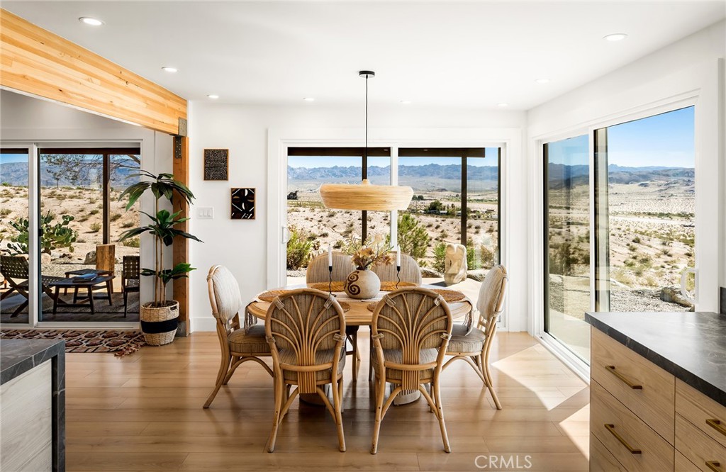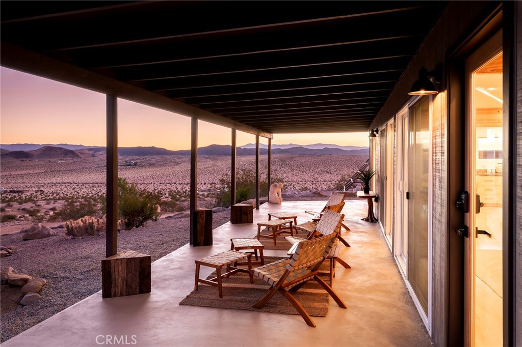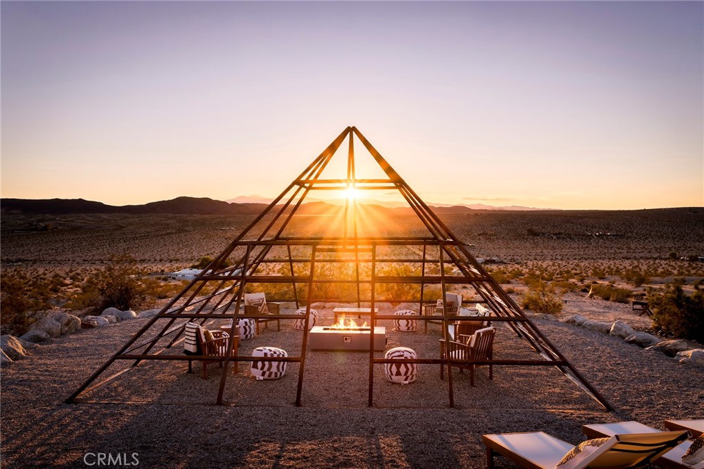29 WEST PYRAMID HOUSE: Perched on the top of its own mountain, this striking 2-bedroom, 2-bathroom retreat delivers 360-degree views spanning Indian Cove in Joshua Tree National Park, Big Bear, and San Gregorio. Framed by dramatic imported boulders and pristine desert landscape, the property offers a rare blend of privacy, serenity, and natural beauty. At night, the dark skies transform into a stargazer’s dream, making this a true High Desert sanctuary. The centerpiece of the landscape is a bold steel-frame pyramid, measuring 24′ x 24′ x 14′, positioned at the mountain’s edge. This dramatic outdoor structure creates a visual anchor and an unforgettable backdrop for both day and night desert living. Inside, the home is curated with Venetian plaster walls, lime wash finishes, and custom vertical plaster striping. The open floor plan is framed by expansive sliding glass doors and an 8-foot picture window, pulling the desert scenery directly into the living space. Spa-inspired bathrooms feature floating vanities, backlit mirrors, wood tile, and marble finishes, blending sophistication with soothing desert textures. A shaded porch extends from the living room, offering a peaceful vantage point for sunrise coffee or evenings under the stars. Custom channel lighting in the living room mirrors the sharp lines of the pyramid, emphasizing the interplay of geometry and desert landscape. The large kitchen showcases brand-new counters, custom cabinetry, and generous storage — designed for both everyday use and stylish entertaining. Centrally located at the edge of 29 Palms and Joshua Tree, this property is just minutes from both villages, with easy access to shops, restaurants, and Joshua Tree National Park. Blending bold design, natural elements, and complete privacy, this mountain-top retreat embodies modern desert living at its finest — the kind of home you’d expect to see in the pages of Architectural Digest.