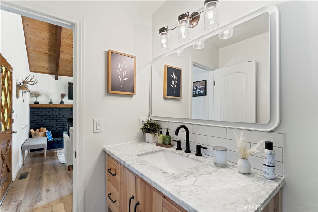 Nestled in the serene beauty of Lake Arrowhead, this enchanting 2 bedroom, 2 bath upgraded home invites you to unwind, reconnect, and savor the best of alpine living. Just minutes from the heart of Lake Arrowhead Village and the whimsical charm of Sky Park at Santa’s Village, this home blends mountain elegance with everyday comfort. Step inside to find a light-filled interior with rustic wood beam ceilings, an open-concept living area, and a stone-framed fireplace that sets the tone for cozy nights in. The fully appointed kitchen features modern appliances, updated cabinetry, and a breakfast bar perfect for morning coffee or evening wine. Both bedrooms offer peaceful forest views and thoughtful design, while the beautifully updated bathrooms boasts a soaking tub and shower with artisan tile work, creating a luxury experience. Outdoors offers a spacious forest view deck opening up to treetop vistas and breathtaking sunsets ideal for entertaining, grilling, or simply soaking in mother nature. Towering pines surround the property, offering privacy and a sense of seclusion, while still being close to shops, dining, and year round recreation. Whether you’re hosting friends around the fireplace, sipping cider beneath the stars, or enjoying morning hikes by the lake, this home is the perfect escape crafted for those who crave nature, comfort, and connection.