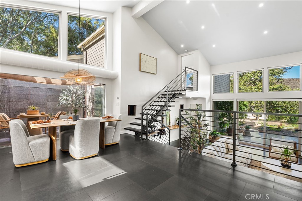Perched in the exclusive Ridgeview enclave of Turtle Rock, this move-in-ready architectural stunner embodies the pinnacle of modern Irvine living. Spanning 2,173 square feet, the home showcases four bedrooms, three designer baths, and an effortless fusion of elegance and comfort. Walls of glass invite breathtaking canyon vistas, while its premier location near Sand Canyon Reservoir and Strawberry Farms Golf Club places nature, recreation, and sophistication at your doorstep—all within reach of Irvine’s award-winning schools. Few homes capture beauty, serenity, and style quite like this one. Completely reimagined with high-end materials and sleek modern design, this residence blends comfort, style, and craftsmanship at every turn. The chef’s kitchen is a showpiece, featuring a full suite of Viking appliances—including a built-in refrigerator, 60-inch professional range, microwave, dishwasher, and 250-bottle wine refrigerator—along with a built-in Miele espresso machine for the perfect morning indulgence. Quartz countertops, a glass backsplash, and custom lift-up cabinetry create a refined aesthetic, while basalt and custom wood flooring flow seamlessly throughout. The kitchen opens to both informal and formal dining spaces that flank a dramatic atrium water feature, where water cascades gracefully down a nine-by-ten-foot wall; glass walls surrounding these dining areas flood the space with natural light and provide effortless indoor-outdoor access. The living room’s basalt-clad fireplace serves as a striking focal point, and three sets of disappearing glass doors open to expansive canyon views and a beautifully designed backyard retreat featuring multiple seating areas, lush low-maintenance landscaping, and a spacious patio that extends the home’s contemporary aesthetic outdoors. The home offers dual primary suites—one on each level—for flexibility and privacy, with the upper suite showcasing a newly remodeled spa-inspired bath complete with a central rain shower beneath an operable skylight, a sleek quartz-topped dual vanity, and a private balcony overlooking the serene backyard and canyon. The fourth bedroom, currently used as a den, A state-of-the-art security system ensures peace of mind, and residents enjoy access to Ridgeview’s community pool and sports courts. With its refined finishes, modern flow, and seamless indoor-outdoor living, 7 Morning Sun is a move-in ready home designed for those who value luxury, innovation, and exceptional design.